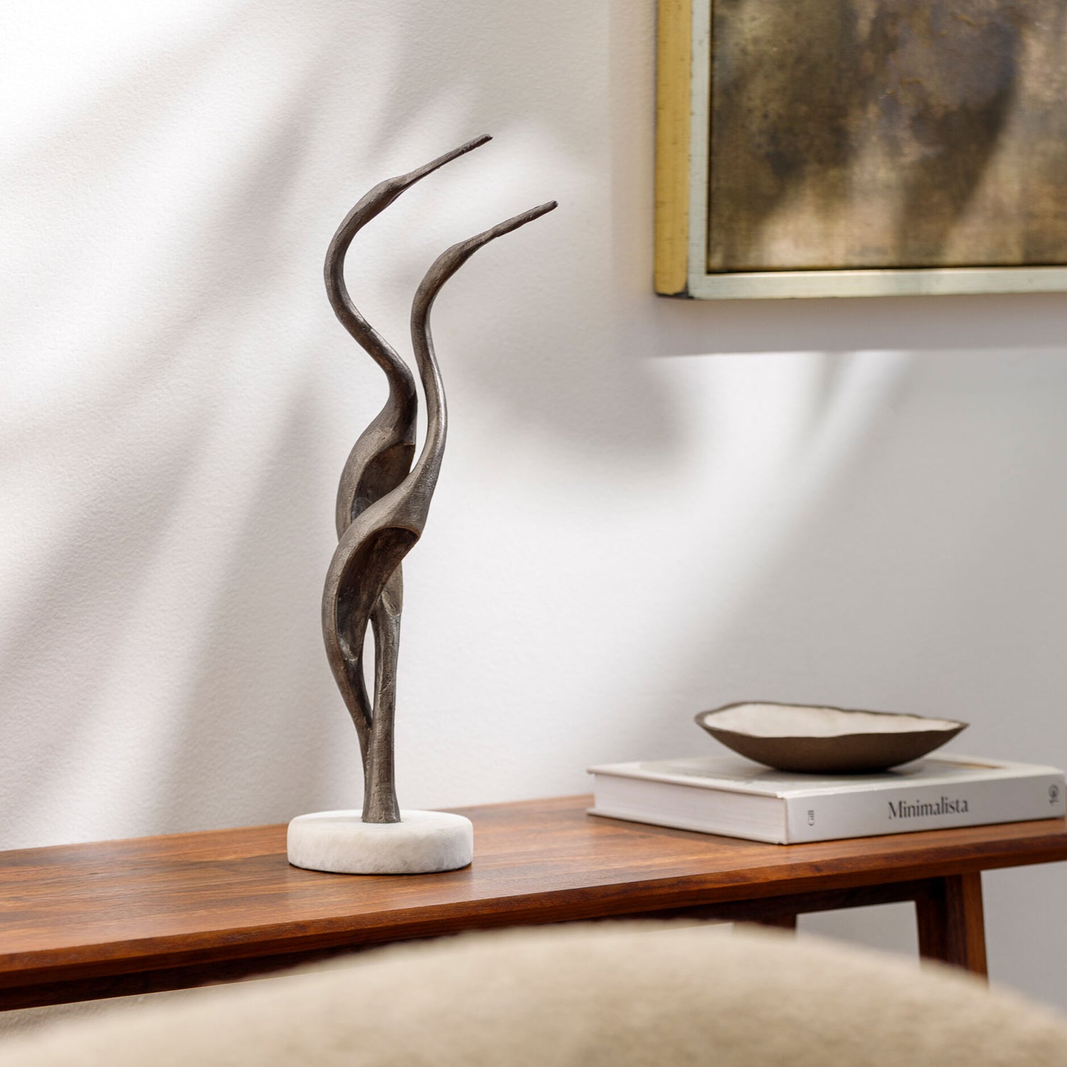 The Hakawai Decorative Sculpture brings a touch of sophistication to any room, crafted from silver blackened iron. This eye-catching piece adds modern charm to tabletops, shelves, or mantels, perfect for enhancing your decor with a unique accent.