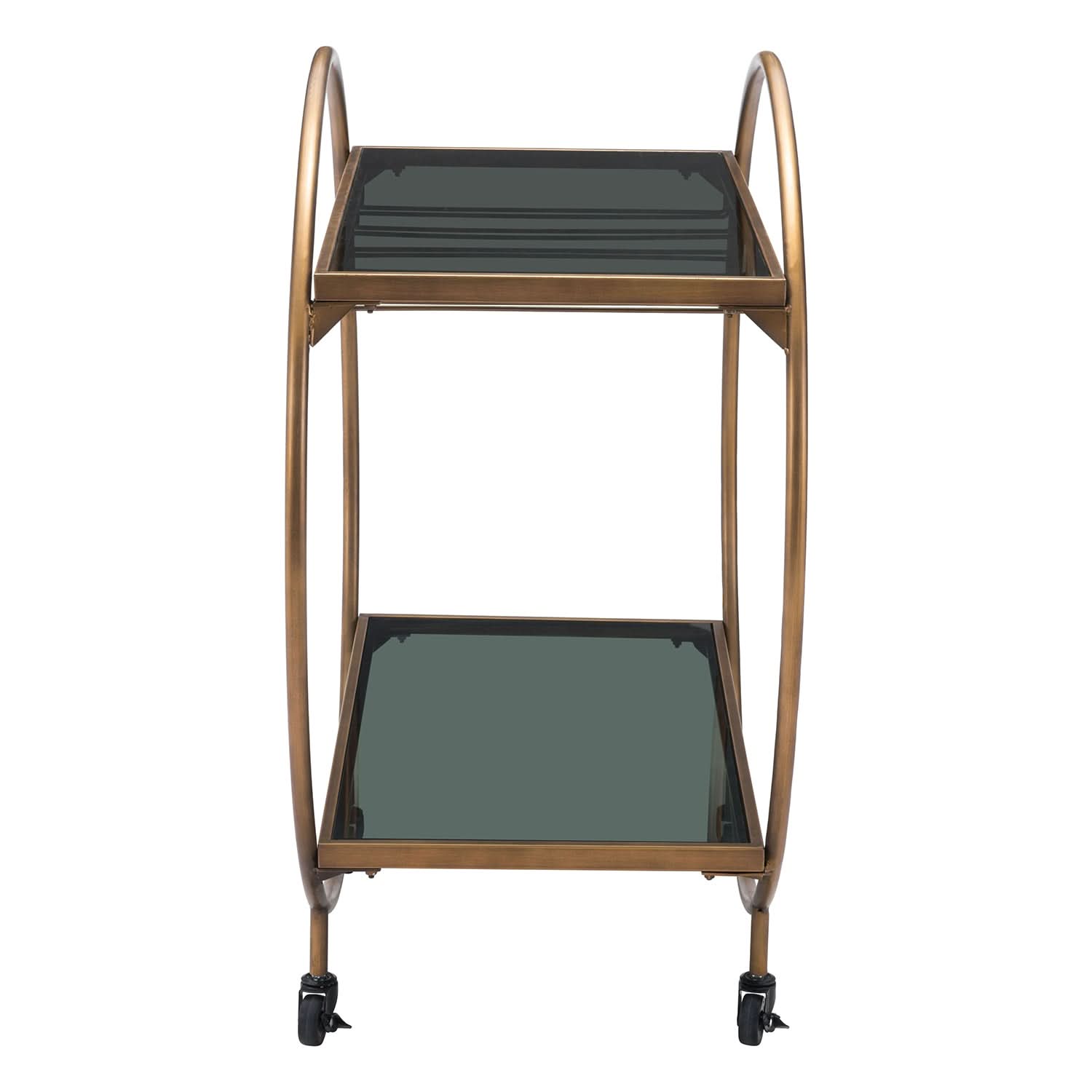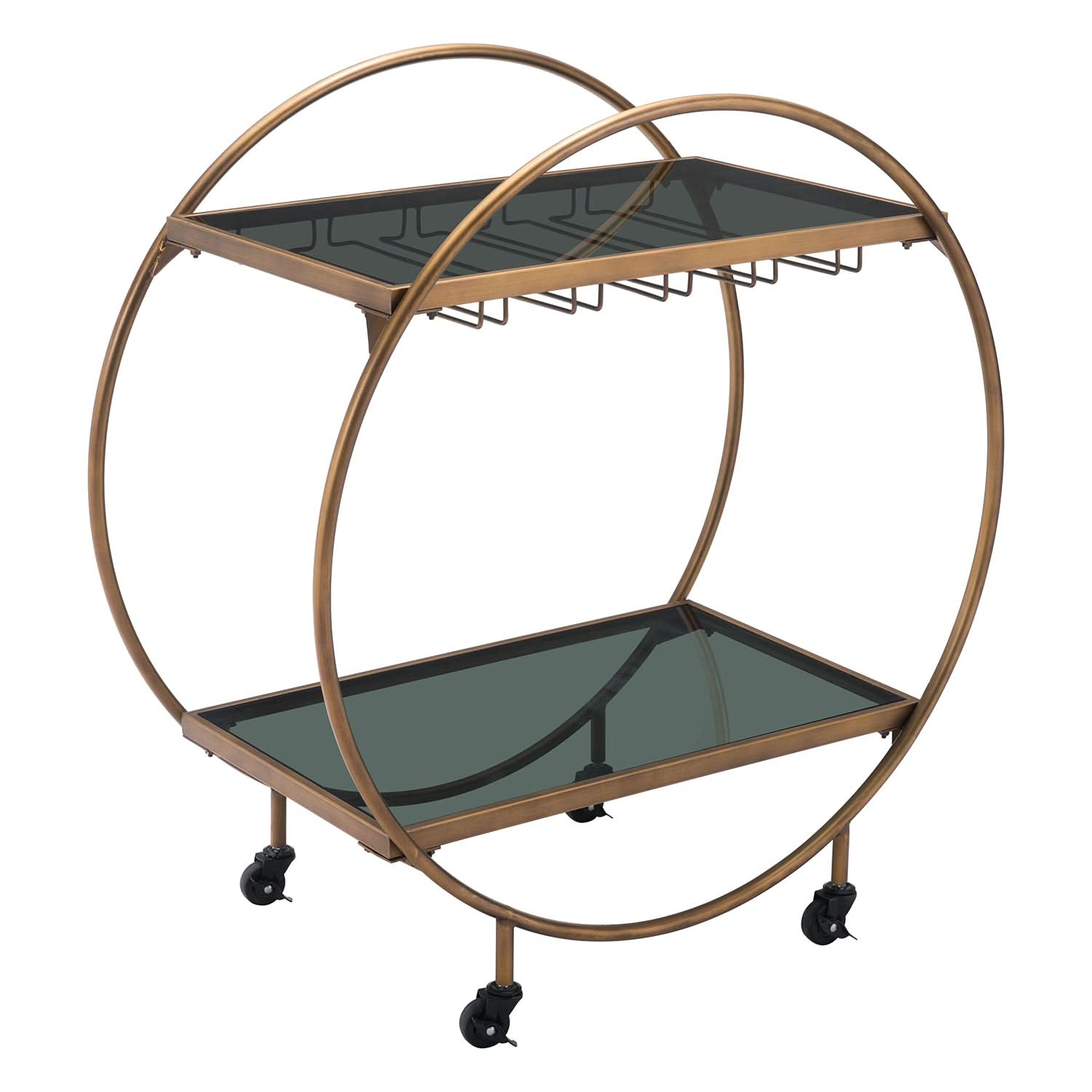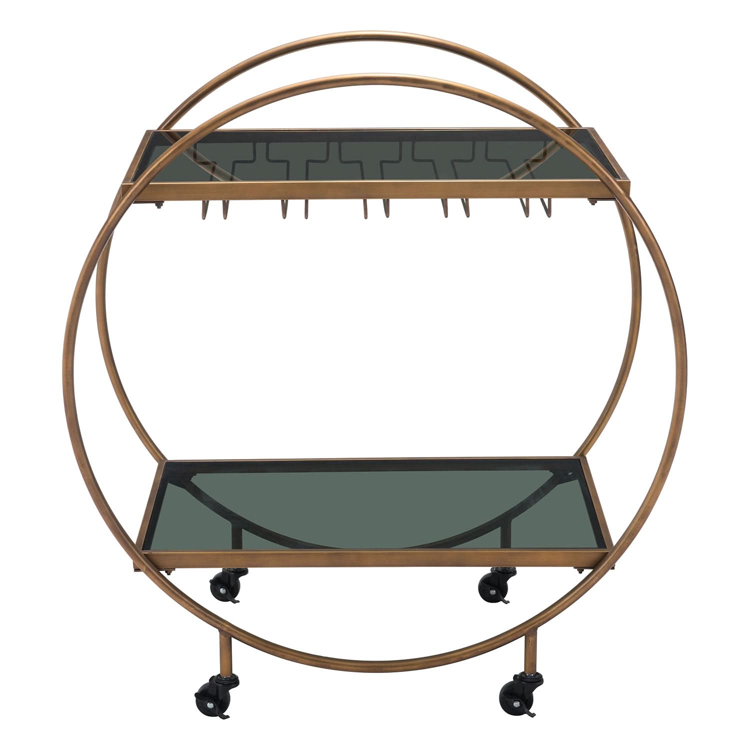 Elevate your entertaining with this stylish and functional Zuo Modern Arc Bar Cart. With its unique circular design, this bar cart features two glass shelves and smooth-rolling casters for easy mobility, making it a chic and practical addition to any space.