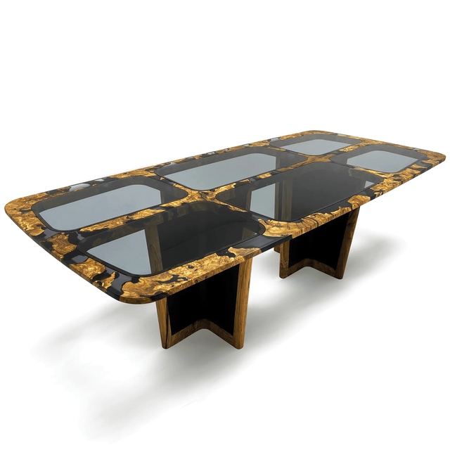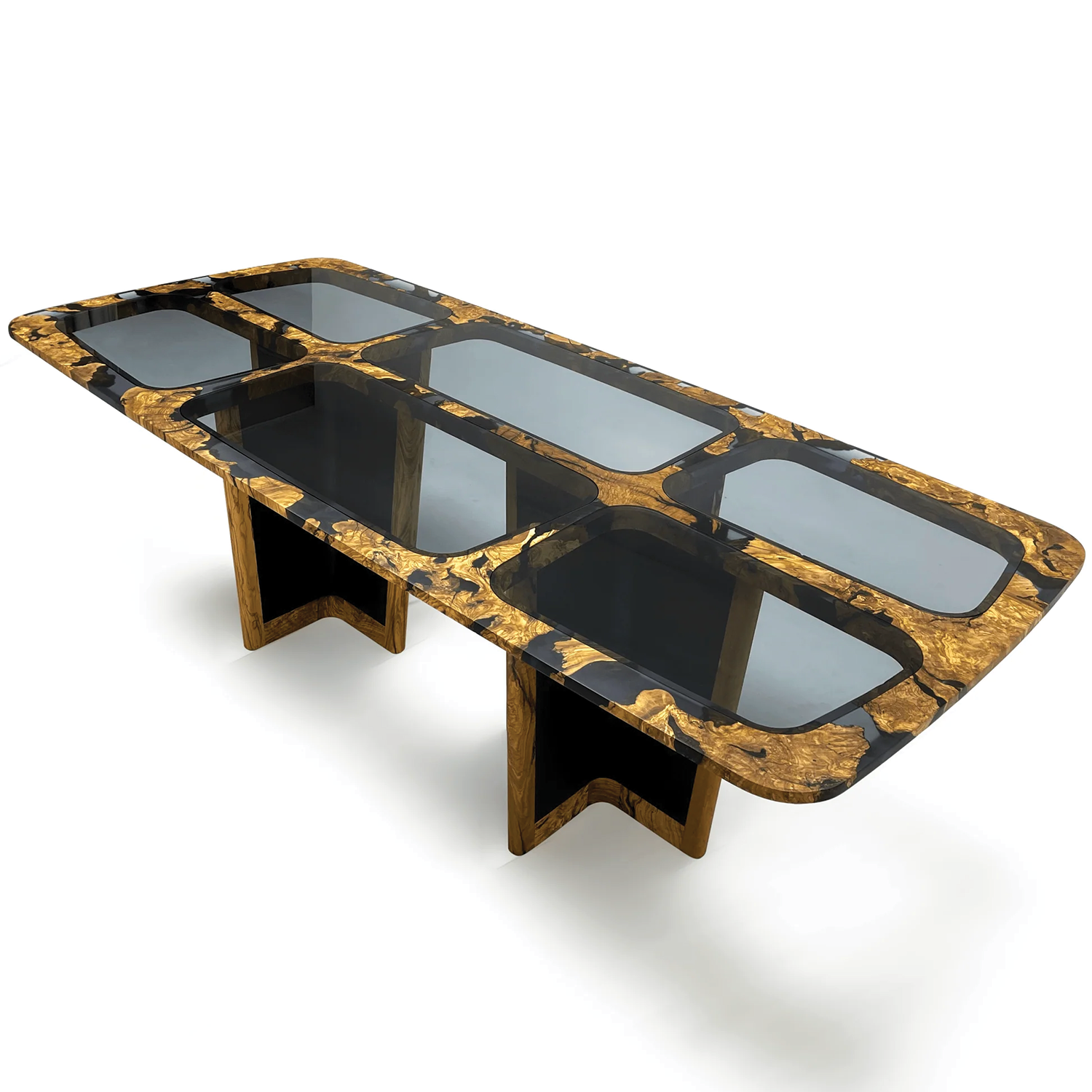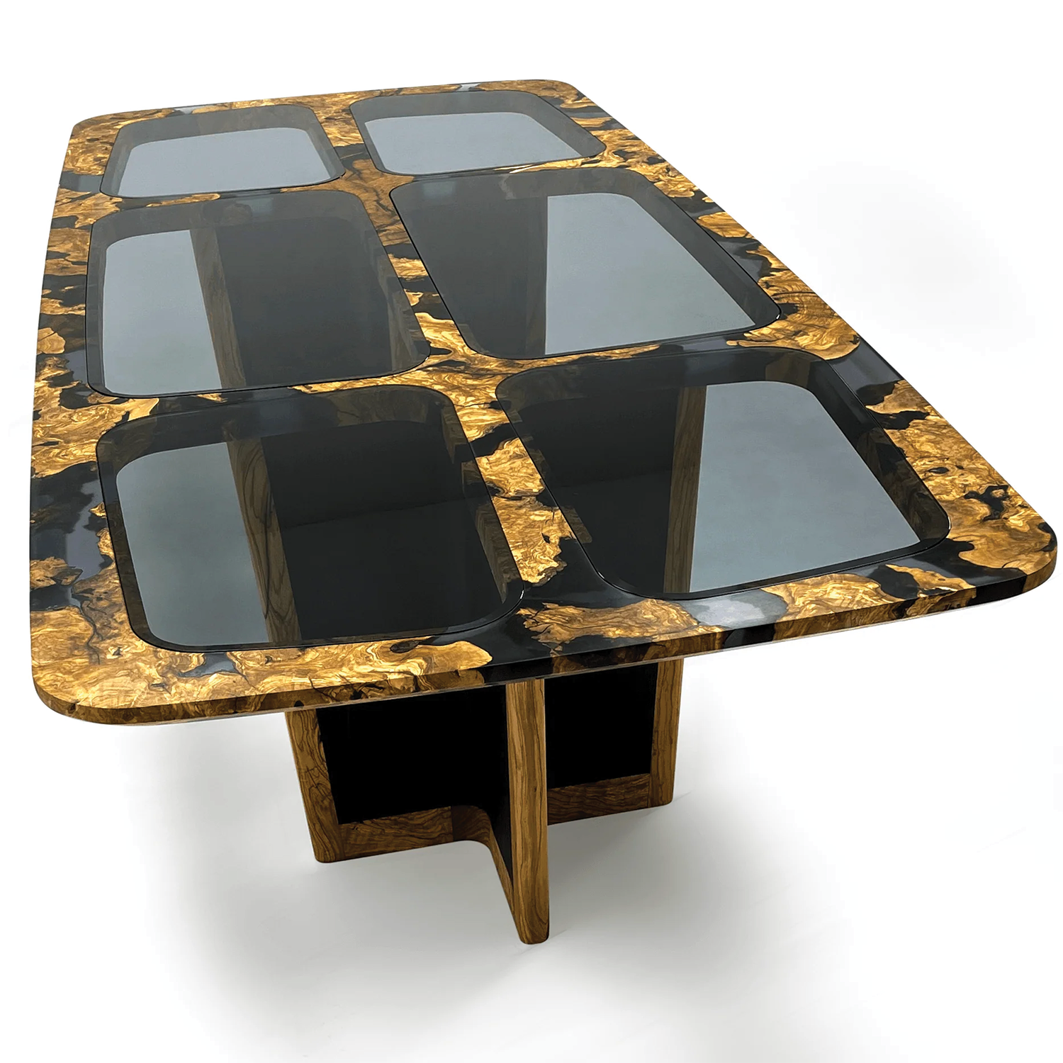 La mesa de comedor Salamis es una obra maestra de la colección Arditi, diseñada para destacarse en cualquier comedor. Esta mesa presenta una combinación única de madera de olivo, resina y vidrio gris medio ahumado, lo que crea una estética sofisticada y lujosa. Cada mesa está hecha a mano meticulosamente por hábiles artesanos en Italia, lo que garantiza una pieza única que irradia elegancia y artesanía.