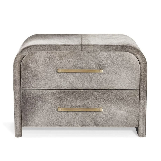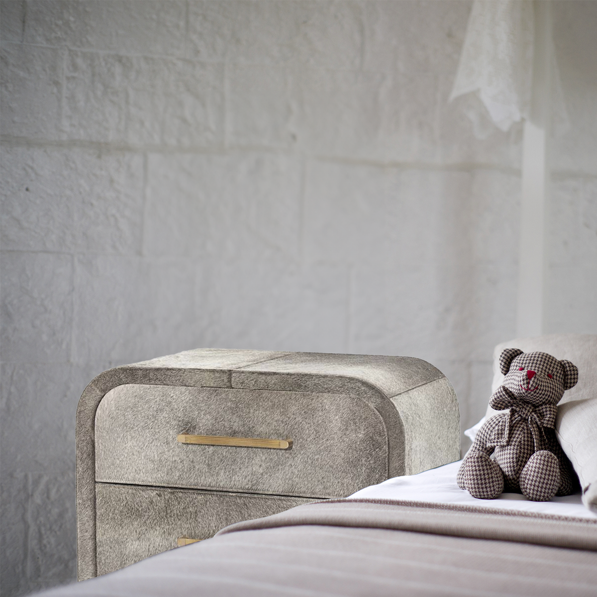La cómoda cuenta con dos cajones espaciosos, cada uno equipado con tiradores elegantes y minimalistas que resaltan la belleza natural de la piel. Estos cajones brindan un amplio espacio para mantener los artículos esenciales al alcance de la mano y, al mismo tiempo, ordenados, lo que ayuda a mantener un ambiente de dormitorio tranquilo y ordenado.