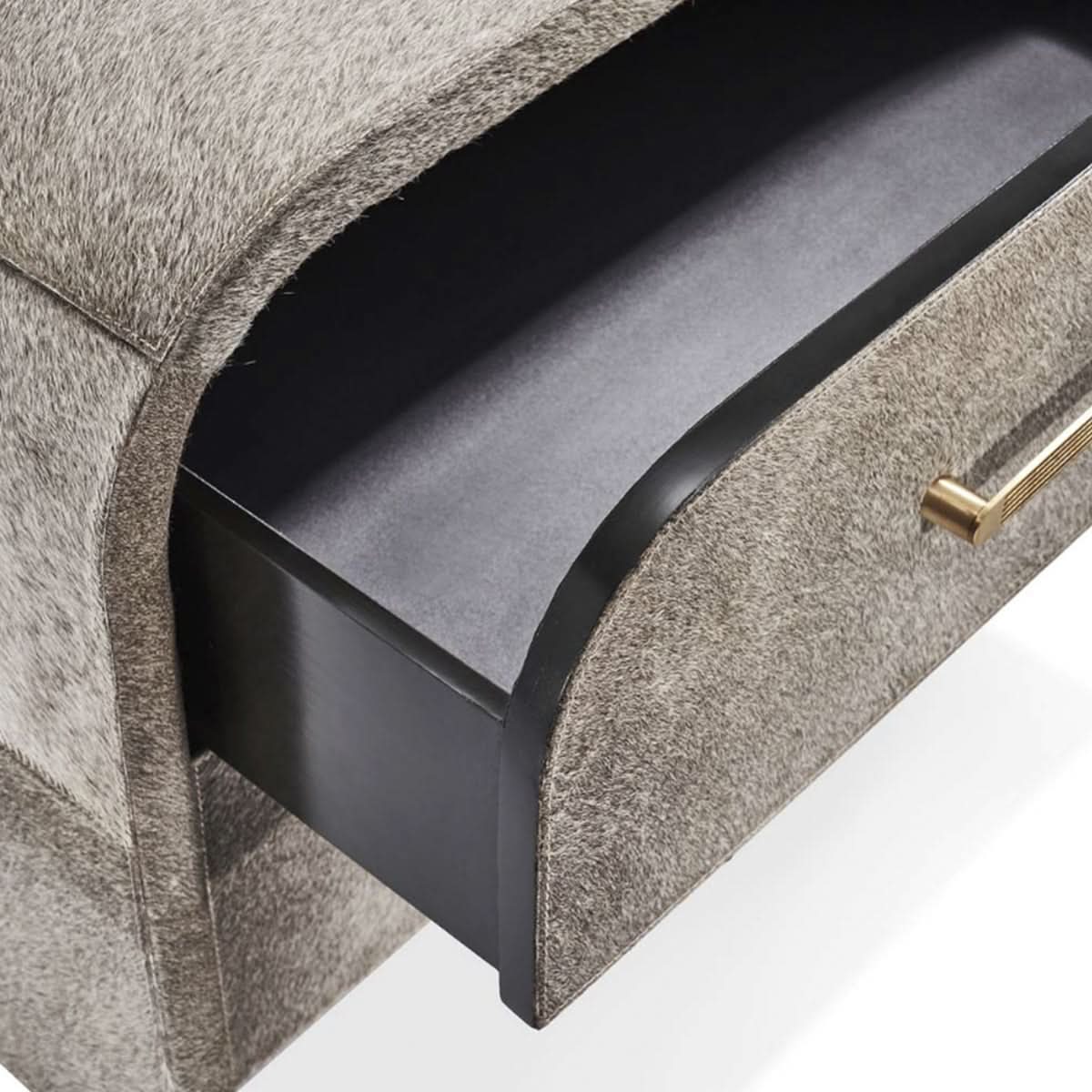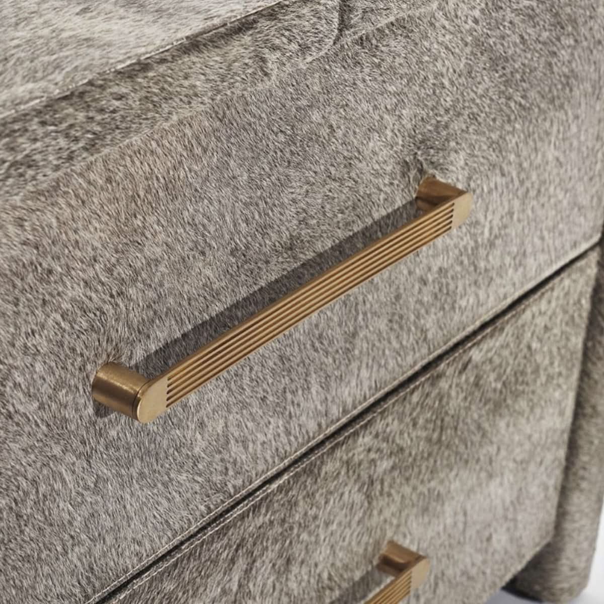 La piel natural utilizada en esta pieza presenta una paleta compleja de matices grises, intercalados con tonos crema, tostado y marrón. Esta variedad de coloración no solo le suma encanto a cada pieza, sino que también permite que la cómoda combine a la perfección con una variedad de estilos de interior, desde lo rústico hasta lo contemporáneo.