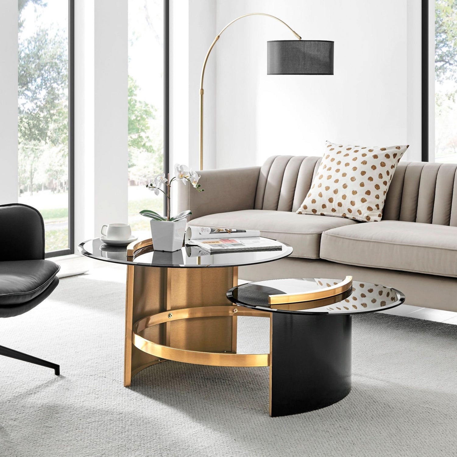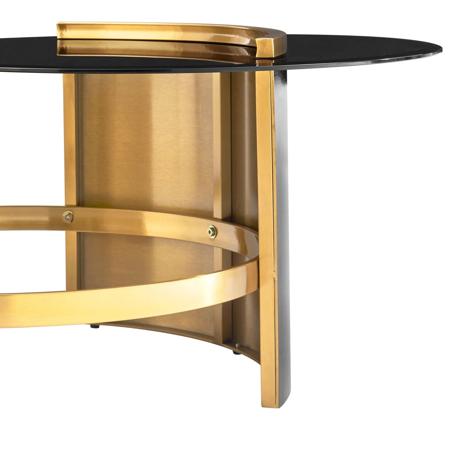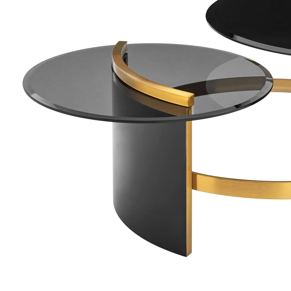 La mesa de centro de vidrio Eclipse Noir es una fascinante combinación de contrastes audaces y curvas elegantes, diseñada para infundirle a cualquier espacio habitable un toque de lujo y encanto vanguardista. Esta exquisita pieza combina la enigmática profundidad del vidrio negro con la calidez radiante de los detalles dorados, creando una atractiva armonía visual.