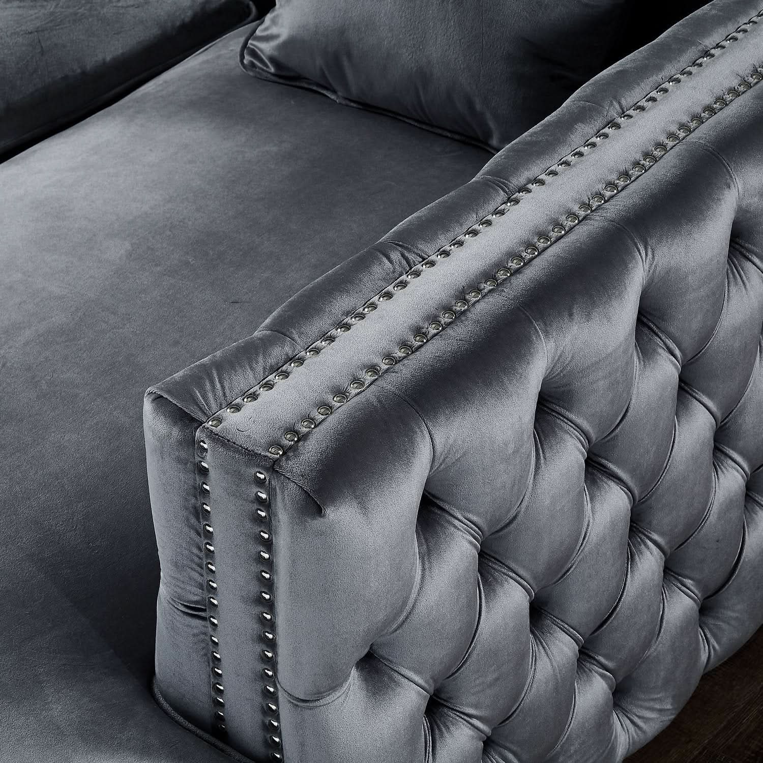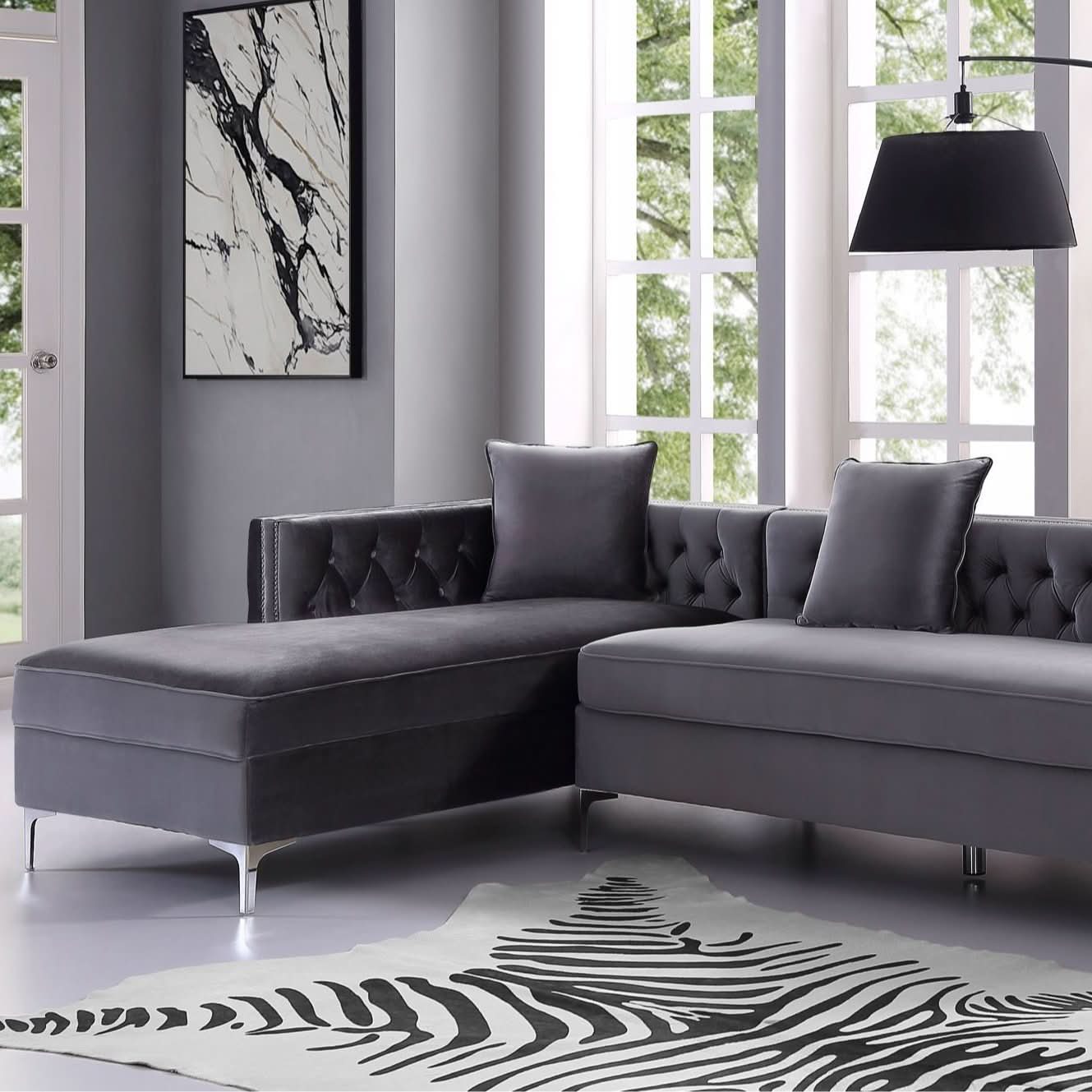 Sofá seccional de terciopelo con chaise longue y espacio de almacenaje Giovanni - Gris / Orientado hacia la izquierda está agotado y se enviará tan pronto como vuelva a estar disponible.