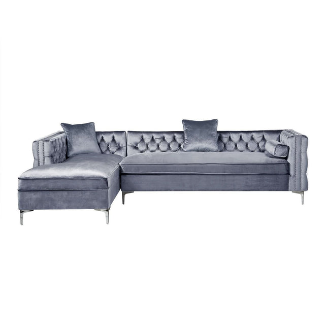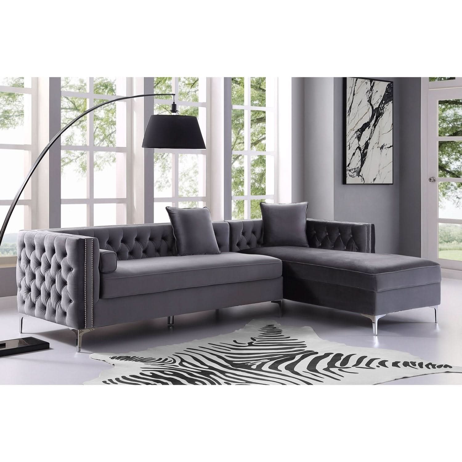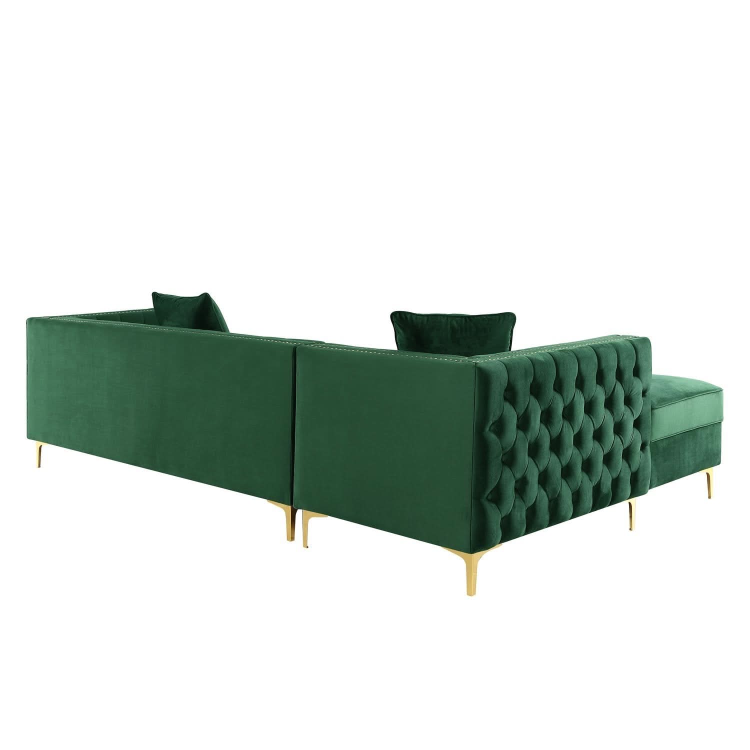 Nuestro sofá modular de terciopelo con chaise longue y orientación hacia la izquierda le dará a su hogar el renacimiento que se merece. La comodidad y el estilo son evidentes en este dinámico sofá. Este sofá modular presenta una tela de terciopelo con botones en tonos intensos y ribetes de tachuelas en contraste que acentúan los brazos cuadrados, el relleno de espuma de alta densidad y las resistentes patas de metal en forma de Y a juego. En este sofá modular, lo tradicional se combina con lo moderno y el resultado es espectacular.