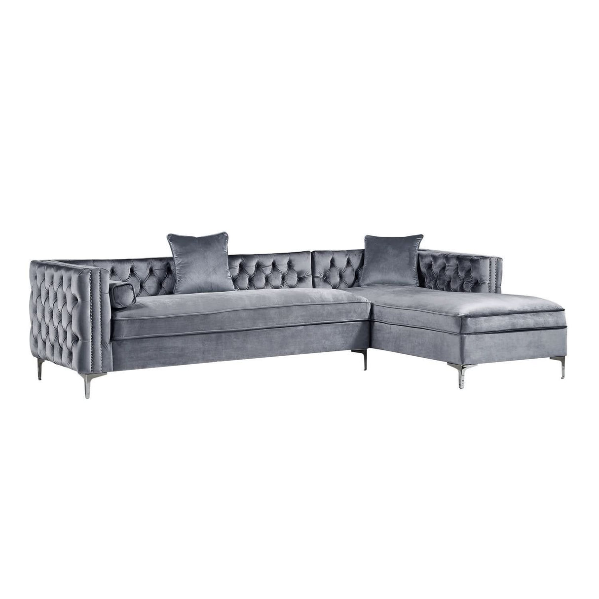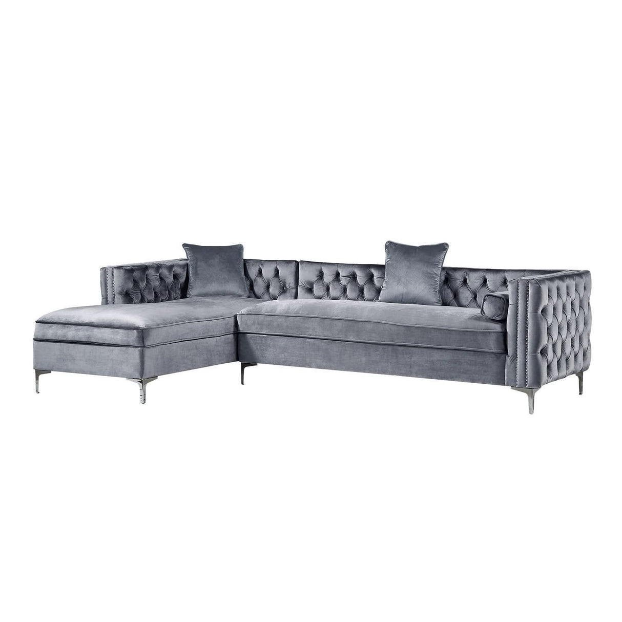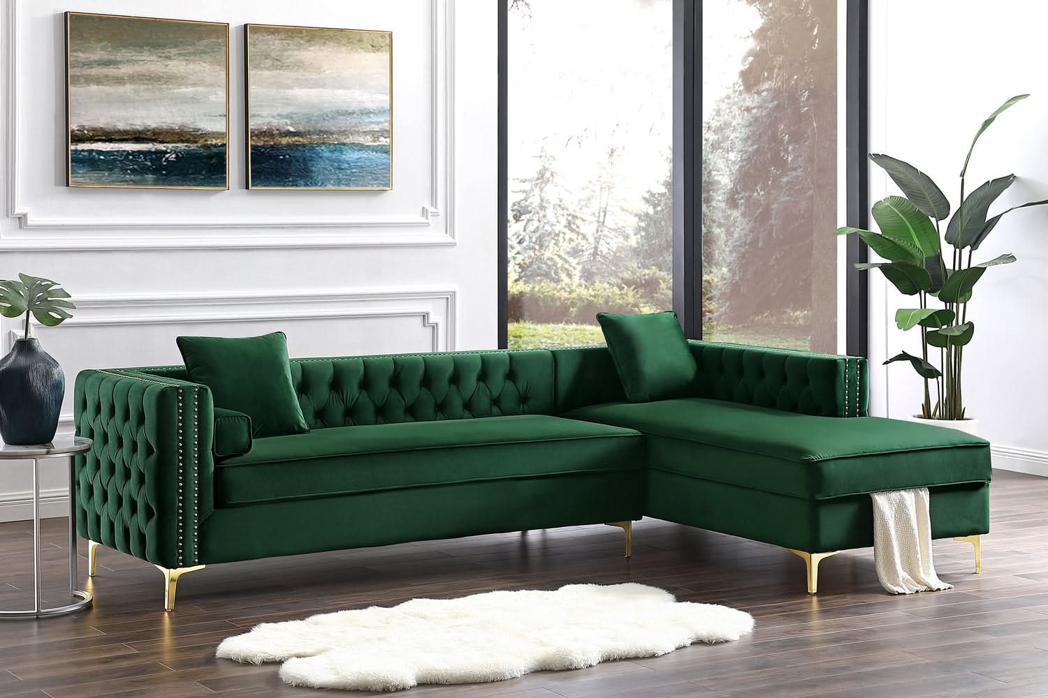 Nuestro sofá modular de terciopelo con chaise longue y orientación hacia la izquierda le dará a su hogar el renacimiento que se merece. La comodidad y el estilo son evidentes en este dinámico sofá. Este sofá modular presenta una tela de terciopelo con botones en tonos intensos y ribetes de tachuelas en contraste que acentúan los brazos cuadrados, el relleno de espuma de alta densidad y las resistentes patas de metal en forma de Y a juego. En este sofá modular, lo tradicional se combina con lo moderno y el resultado es espectacular.