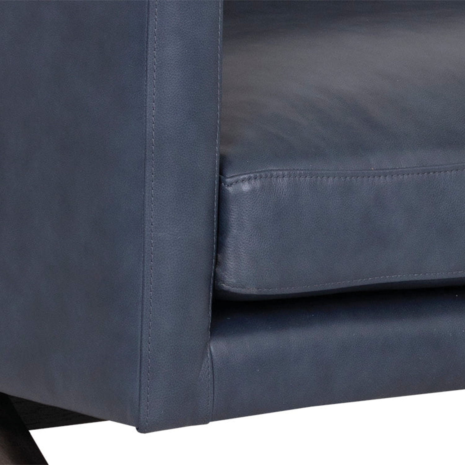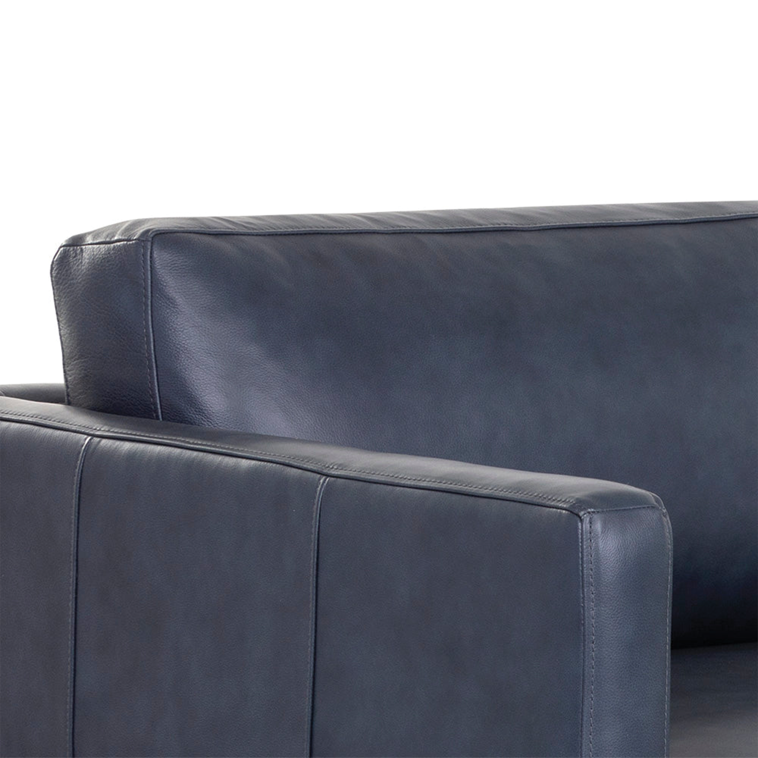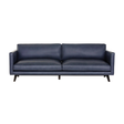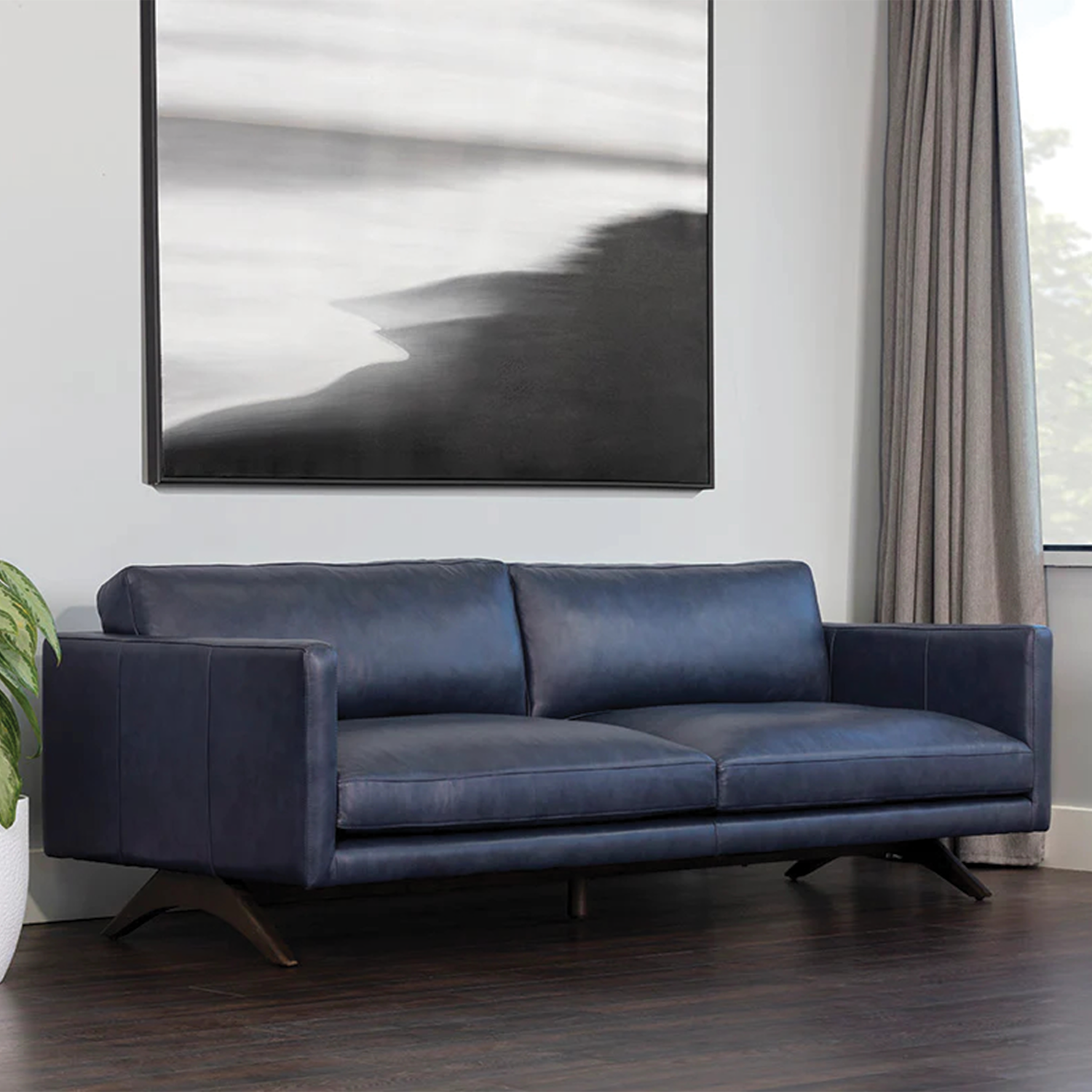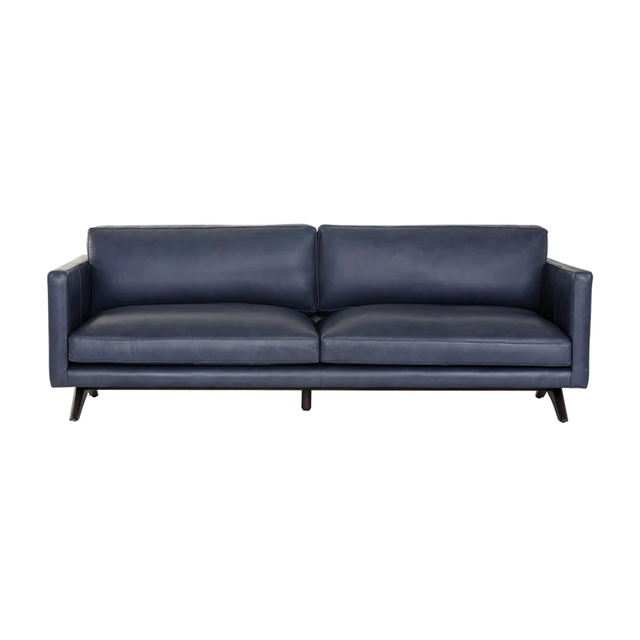 The Rogers Sofa is a stylish, retro-inspired masterpiece designed to add a touch of sophistication to any space. Upholstered in luxurious cortina ink top grain leather, this sofa exudes a masculine charm, perfectly complemented by solid oak wood legs in a rich dark brown finish. Its design blends classic retro aesthetics with modern comfort, making it a stunning focal point in both residential and commercial settings.
