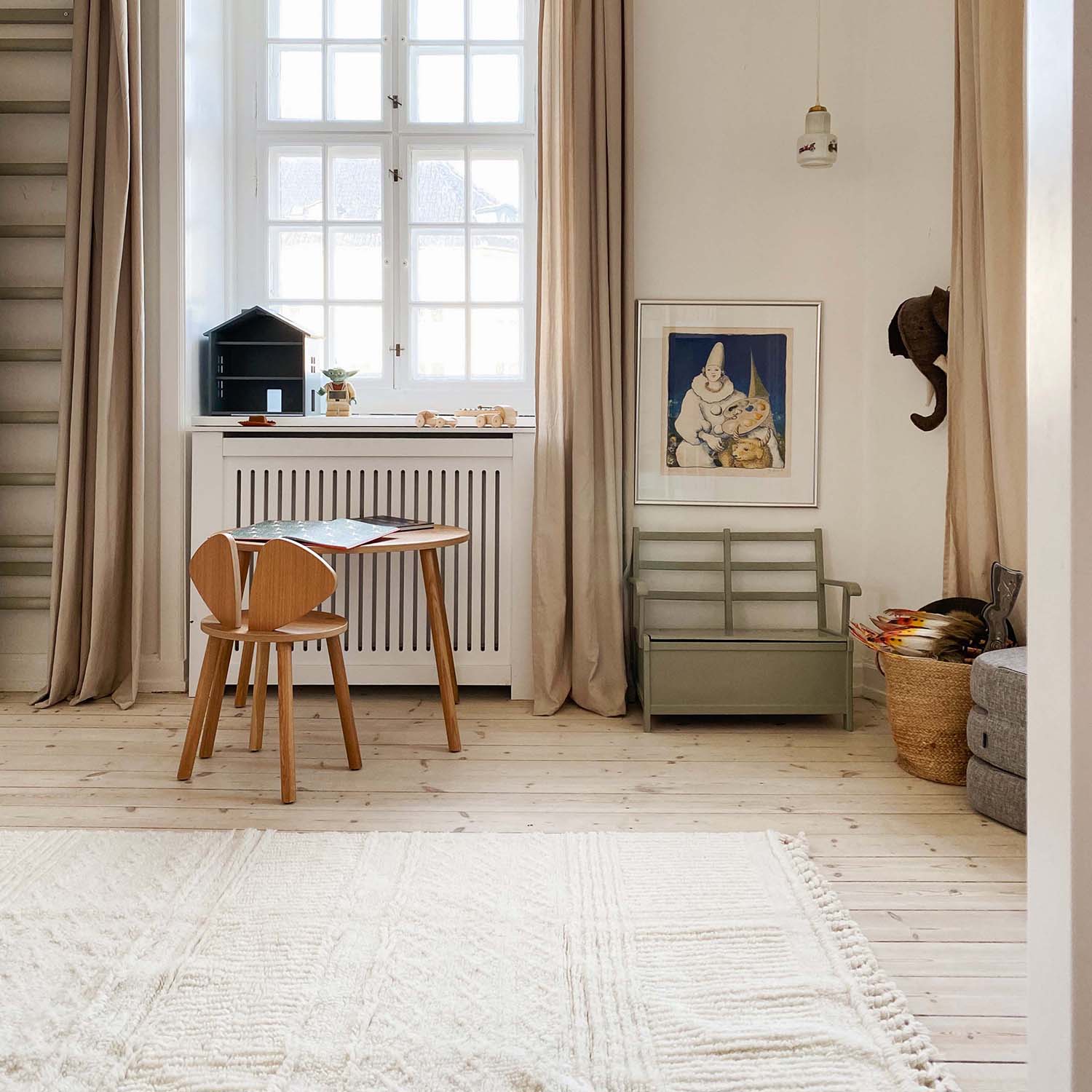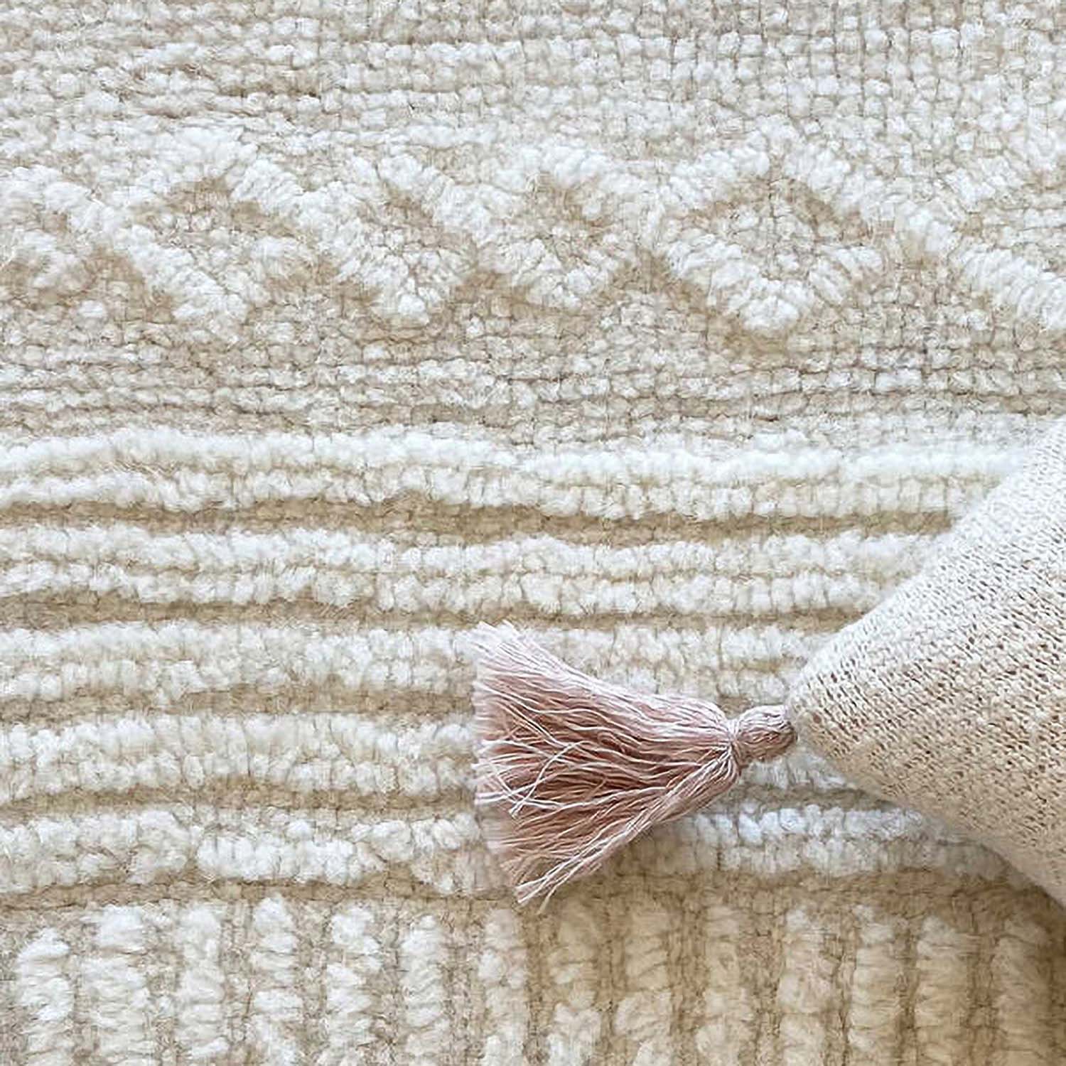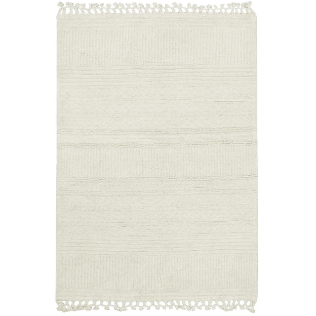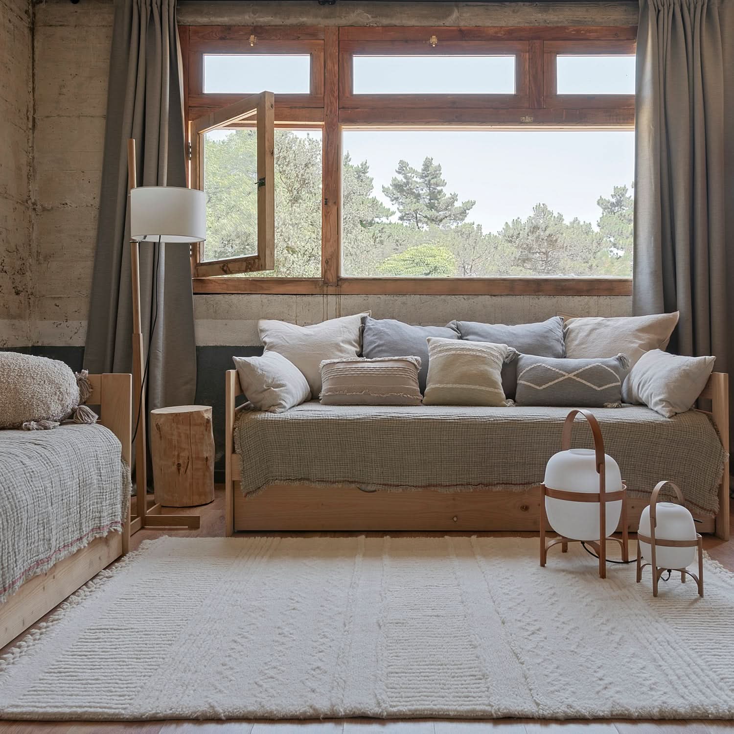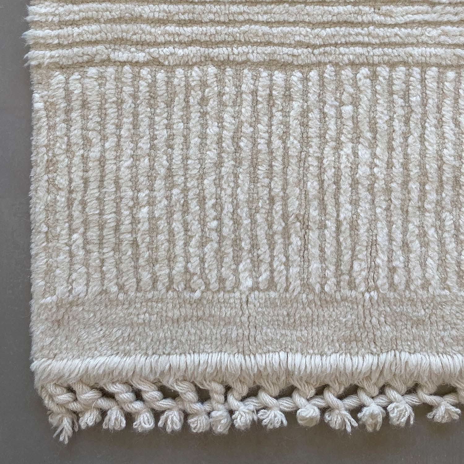 Esta alfombra Ari Sheep White combina varias técnicas de tufting para crear una superficie suave y multitexturada, combinando trazos verticales y horizontales con líneas entrecruzadas para simular trenzas y jugando con diferentes capas de tufting. De color Sheep White por todas partes y terminada en los bordes con flecos trenzados a mano.