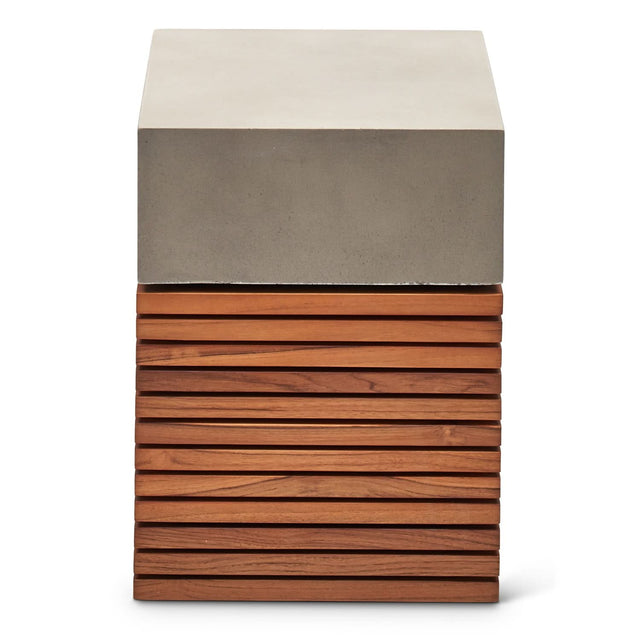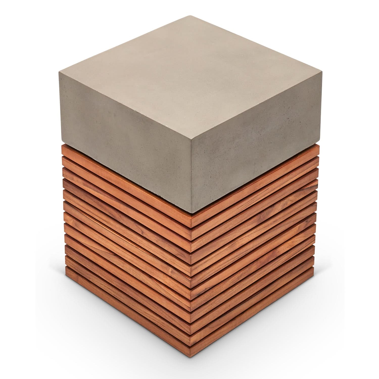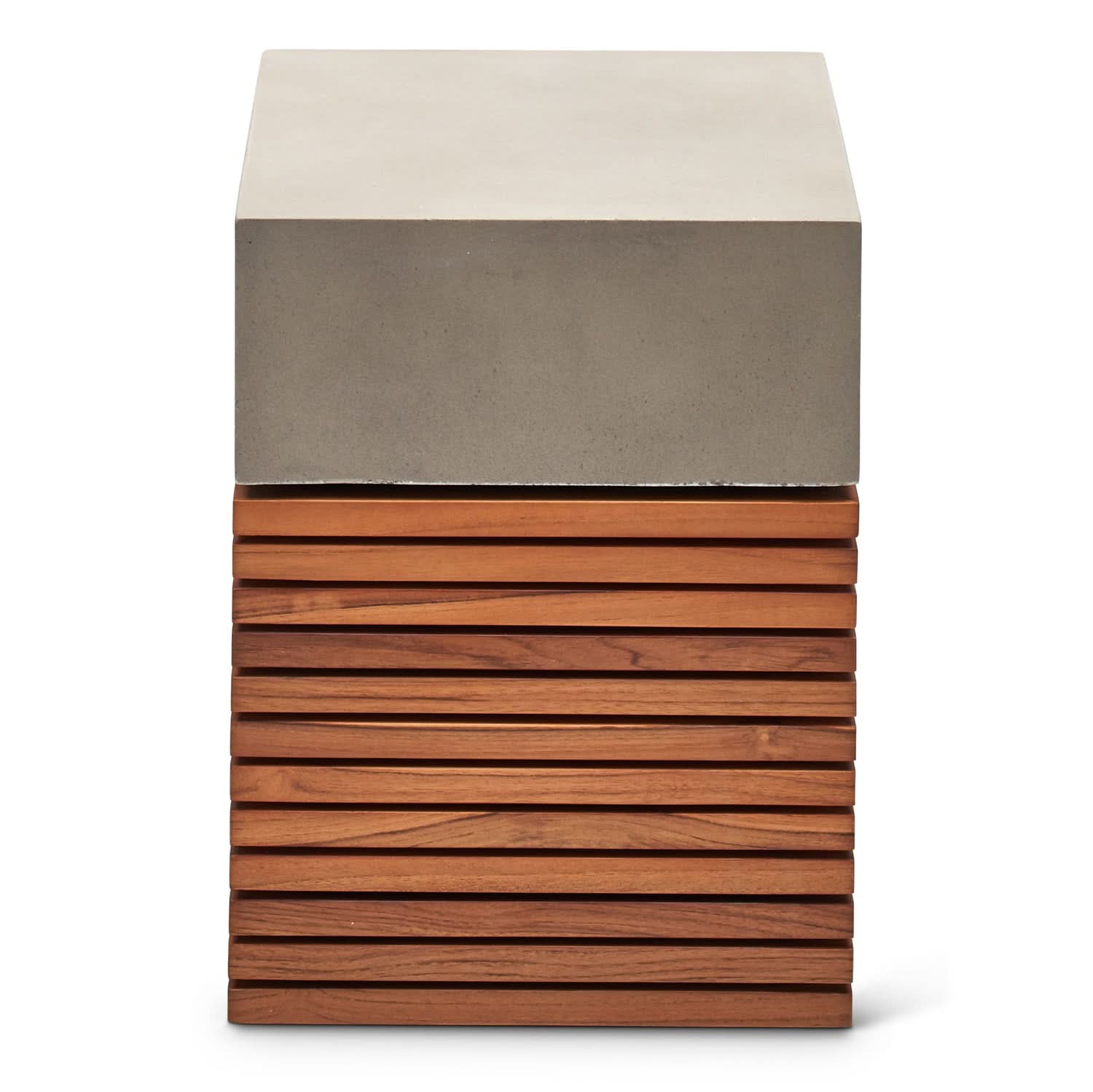 Los taburetes Stecca se caracterizan por el contraste de materiales naturales. Stecca Alto cuenta con una superficie de hormigón con una atractiva base de listones de teca. La combinación hace que el taburete, el pedestal o la mesa auxiliar sean ideales para alegrar una decoración minimalista.