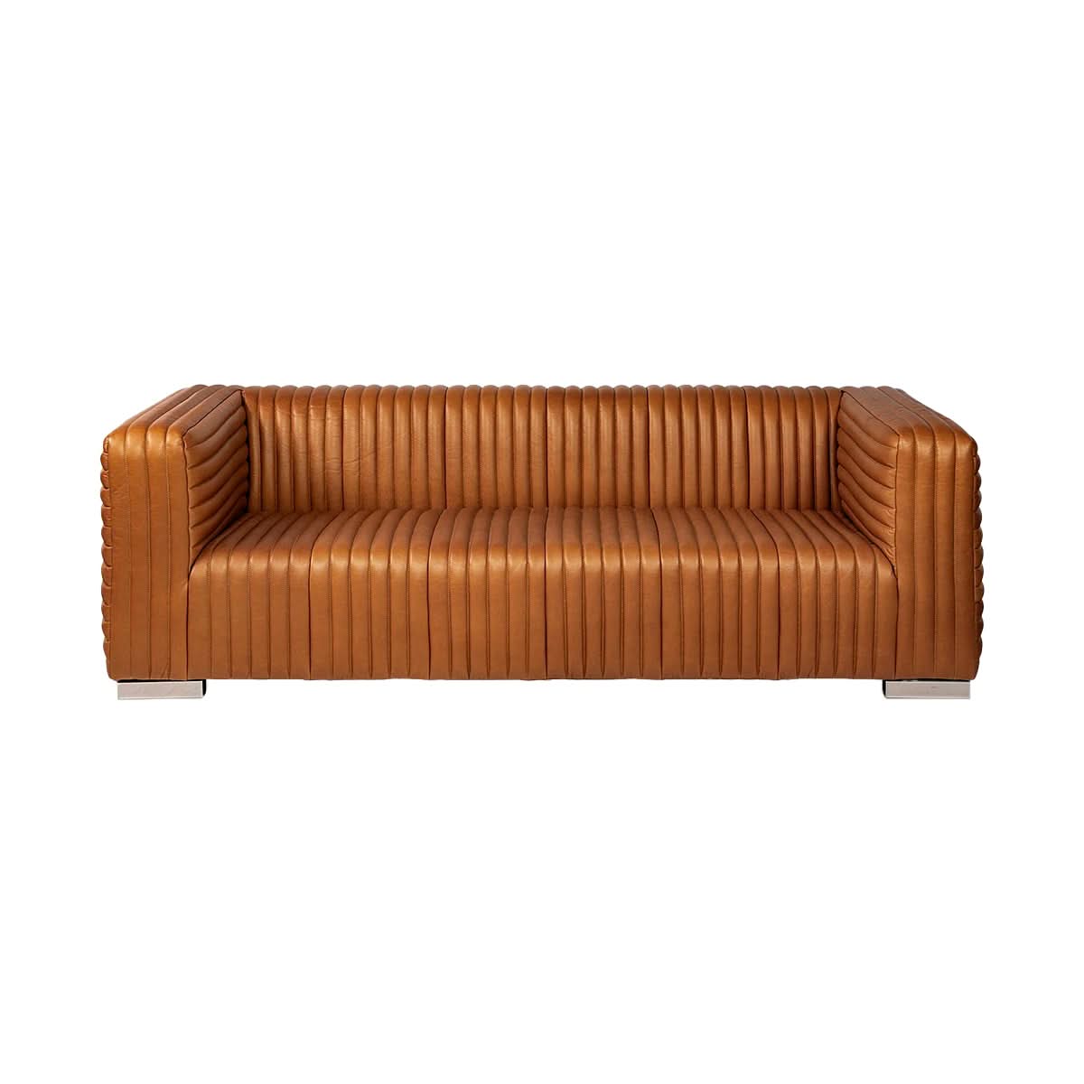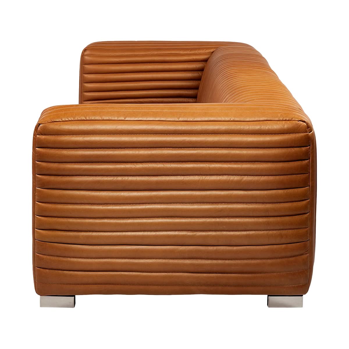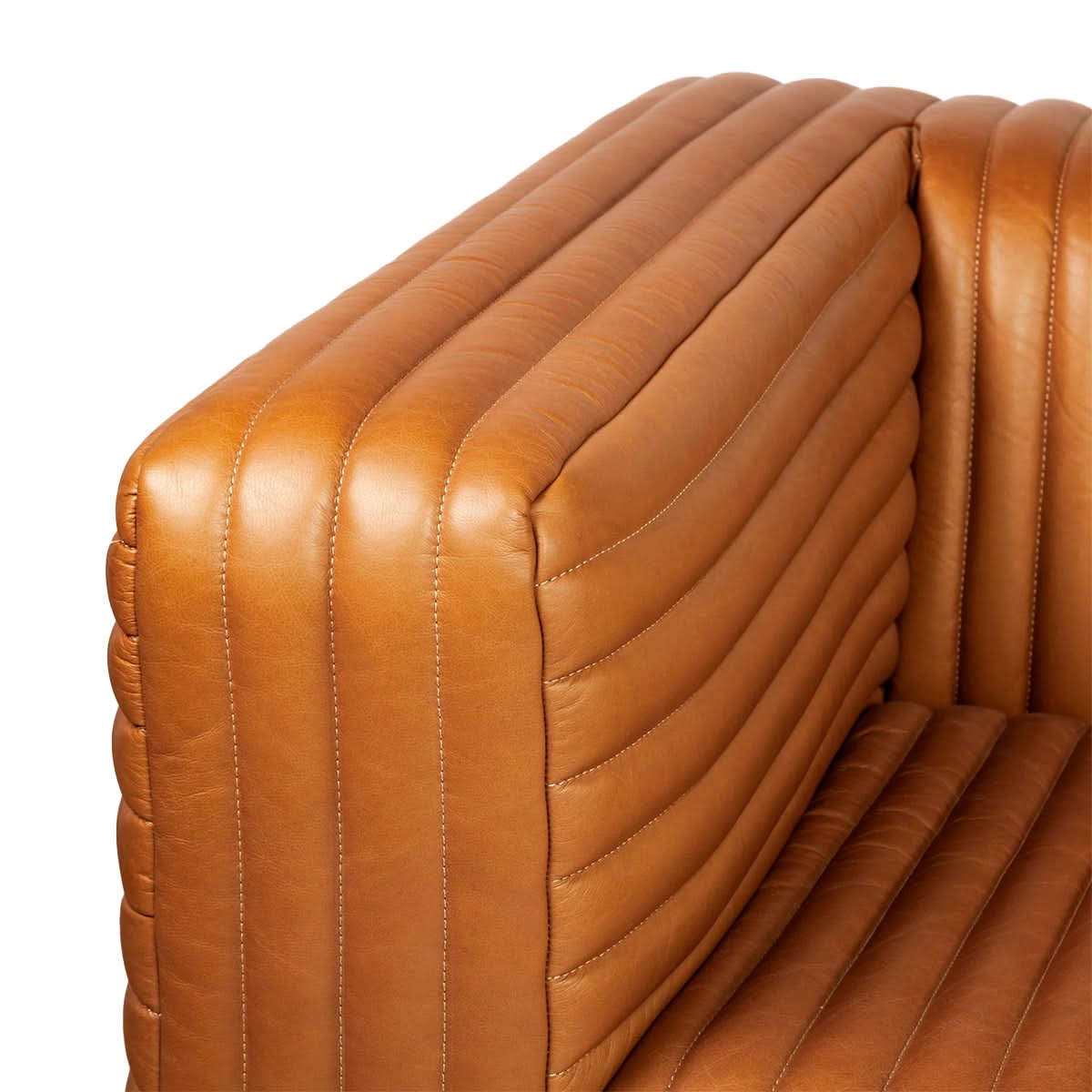 El tono cálido y rico del cuero coñac transmite una sensación de encanto atemporal, mejorando al instante el ambiente de cualquier espacio habitable. Las costuras con mechones acanalados añaden un toque de personalidad y prestigio poderosos, lo que garantiza que el sofá llame la atención desde todos los ángulos. Cada puntada y costura refleja un compromiso con la calidad, un testimonio de una pieza que se convertirá en una parte preciada de su hogar durante años.