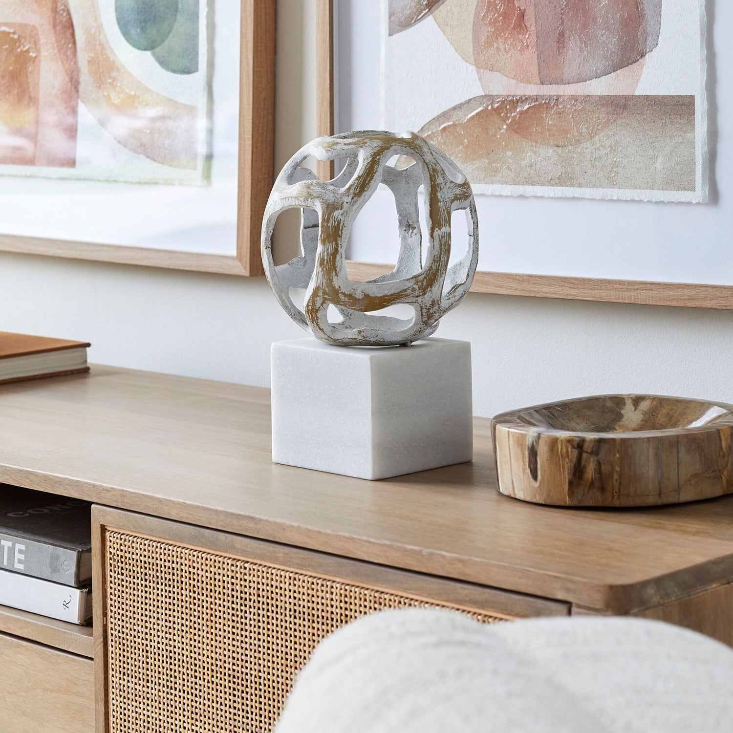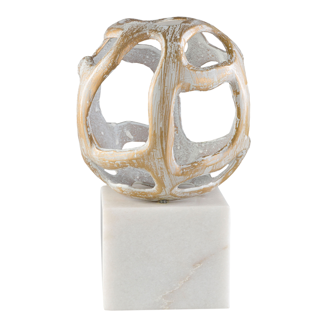 The Orb Decorative Sculpture combines minimalist design with refined materials, featuring a white painted marble sphere atop a natural iron base. This piece adds sophistication to any decor, perfect for accenting shelves, tables, or display cases.