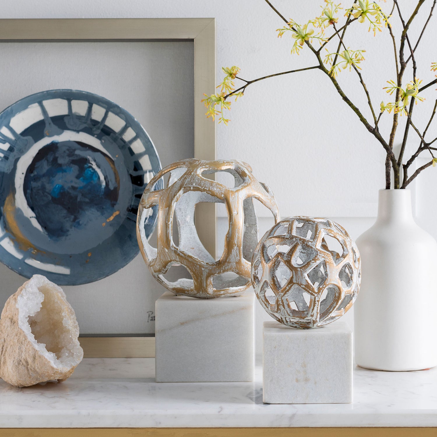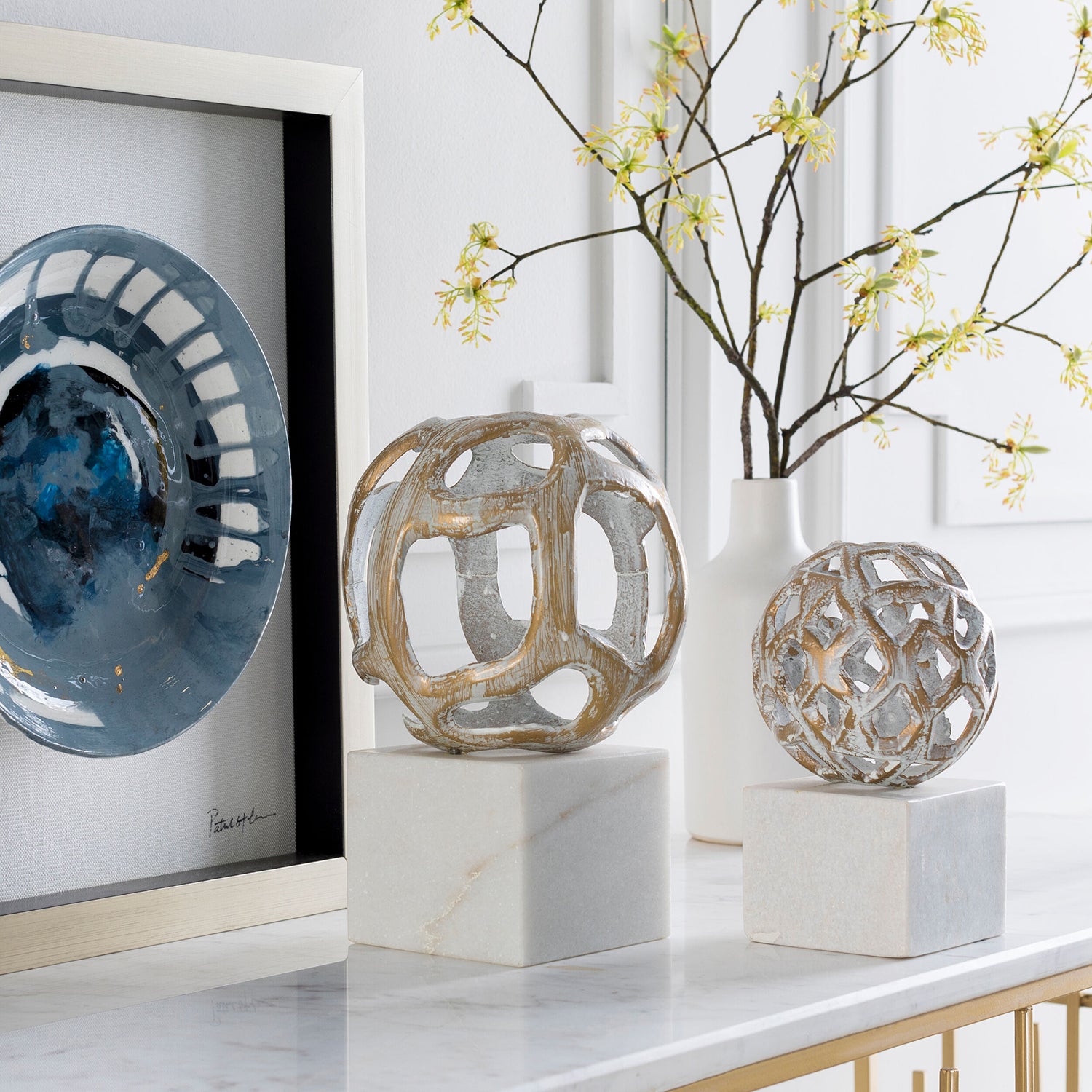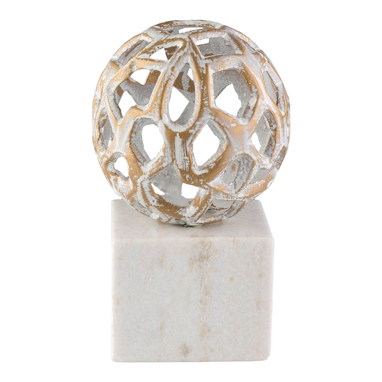 The Orb Sculpture combines minimalist design with refined materials, featuring a white painted marble sphere atop a natural iron base. This piece adds sophistication to any decor, perfect for accenting shelves, tables, or display cases.