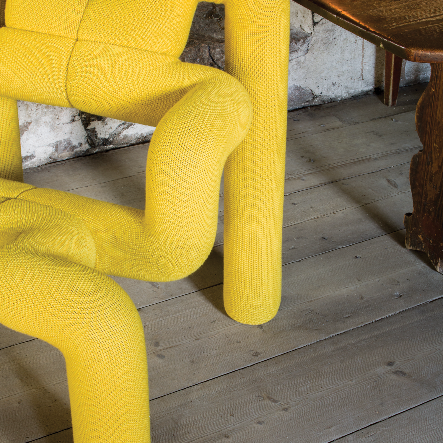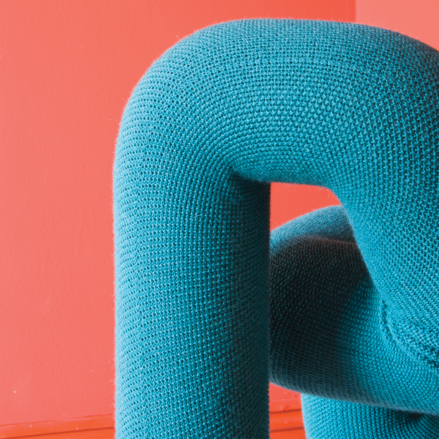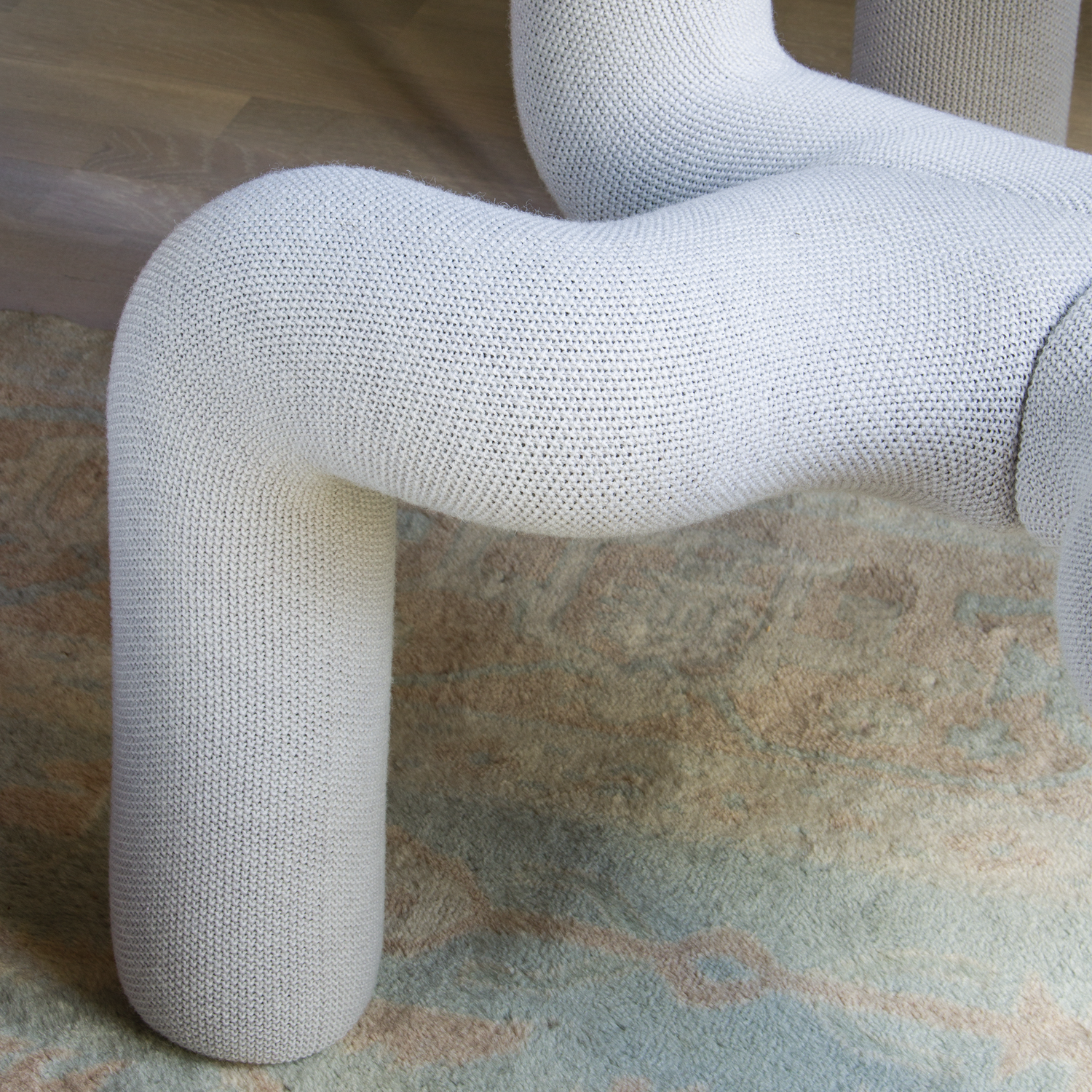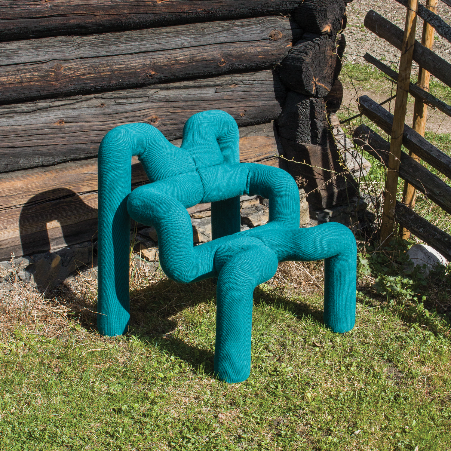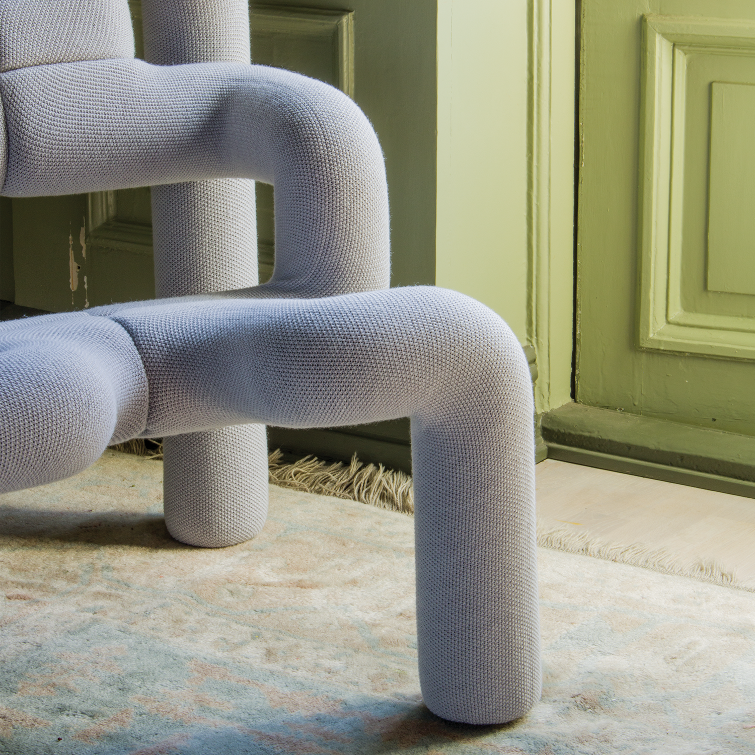 Ekstrem consists of a steel frame covered in soft foam and woolen knit upholstery. It is available in six colorways in Knit, a bespoke woolen upholstery textile by Devold. Knitted from one continuous thread, it provides an elasticity that is essential when fitted to the chair’s organic shape. The knitted fabric is soft, breathable and features a classic quadratic pattern.