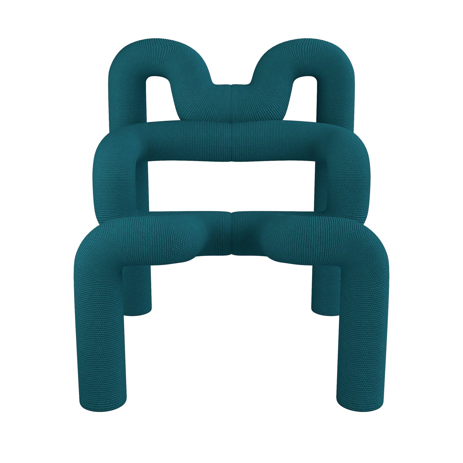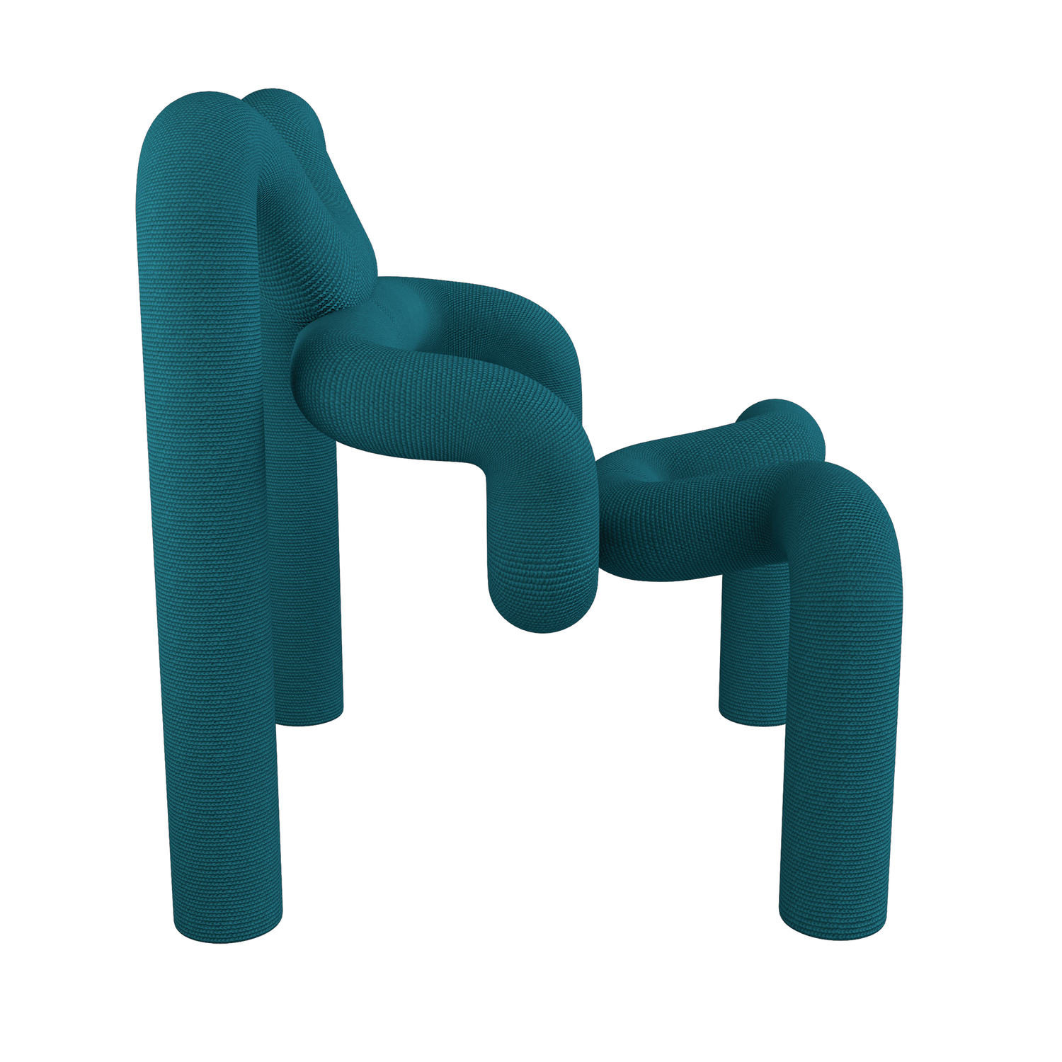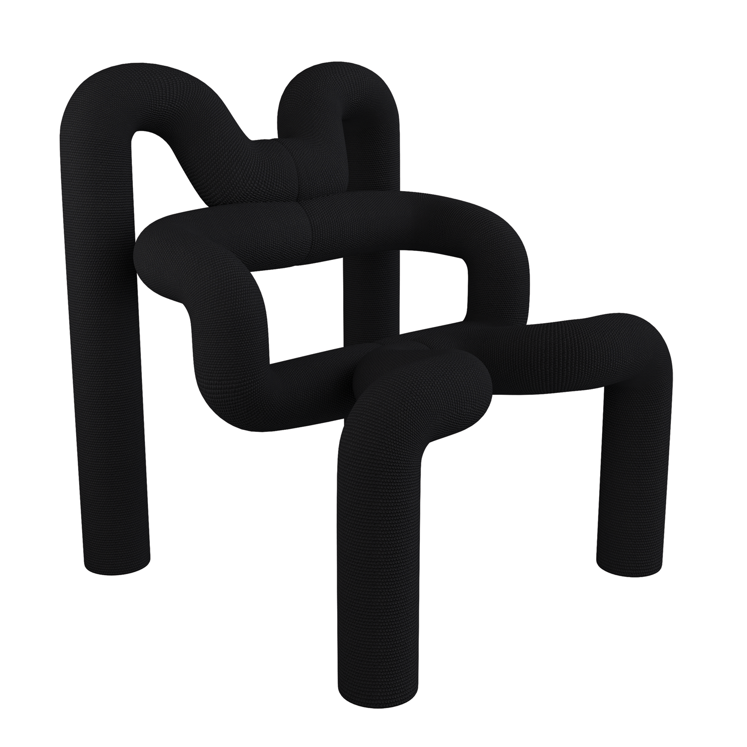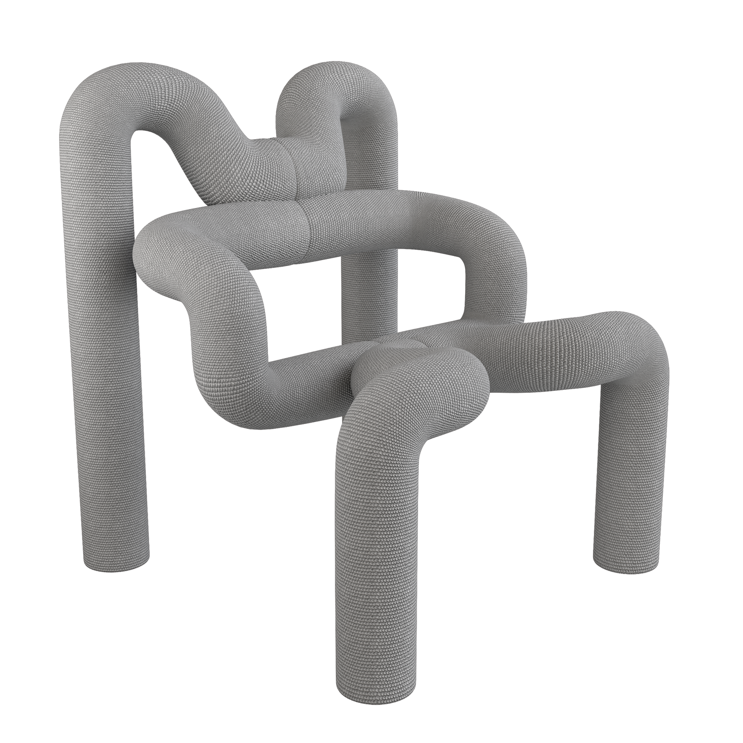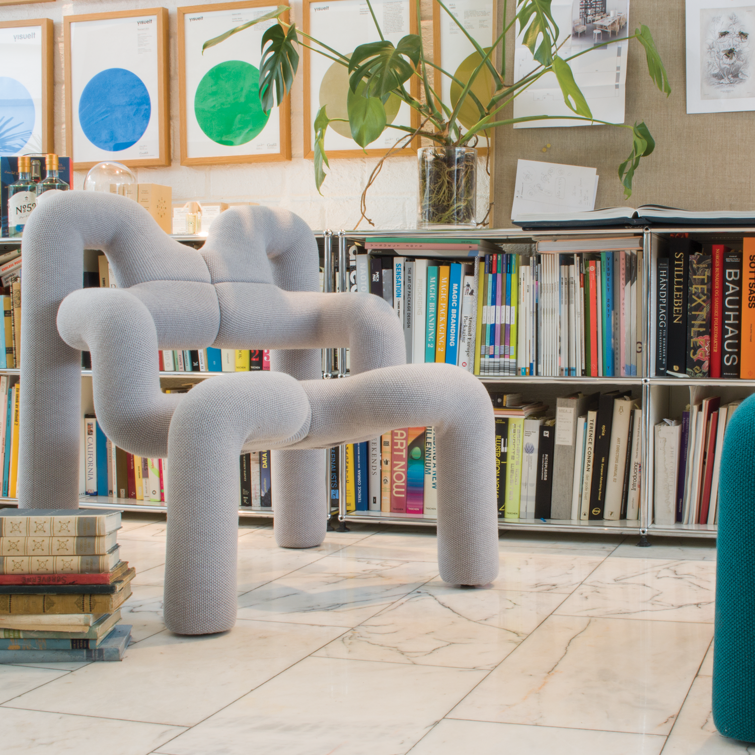 Ekstrem consists of a steel frame covered in soft foam and woolen knit upholstery. It is available in six colorways in Knit, a bespoke woolen upholstery textile by Devold. Knitted from one continuous thread, it provides an elasticity that is essential when fitted to the chair’s organic shape. The knitted fabric is soft, breathable and features a classic quadratic pattern.