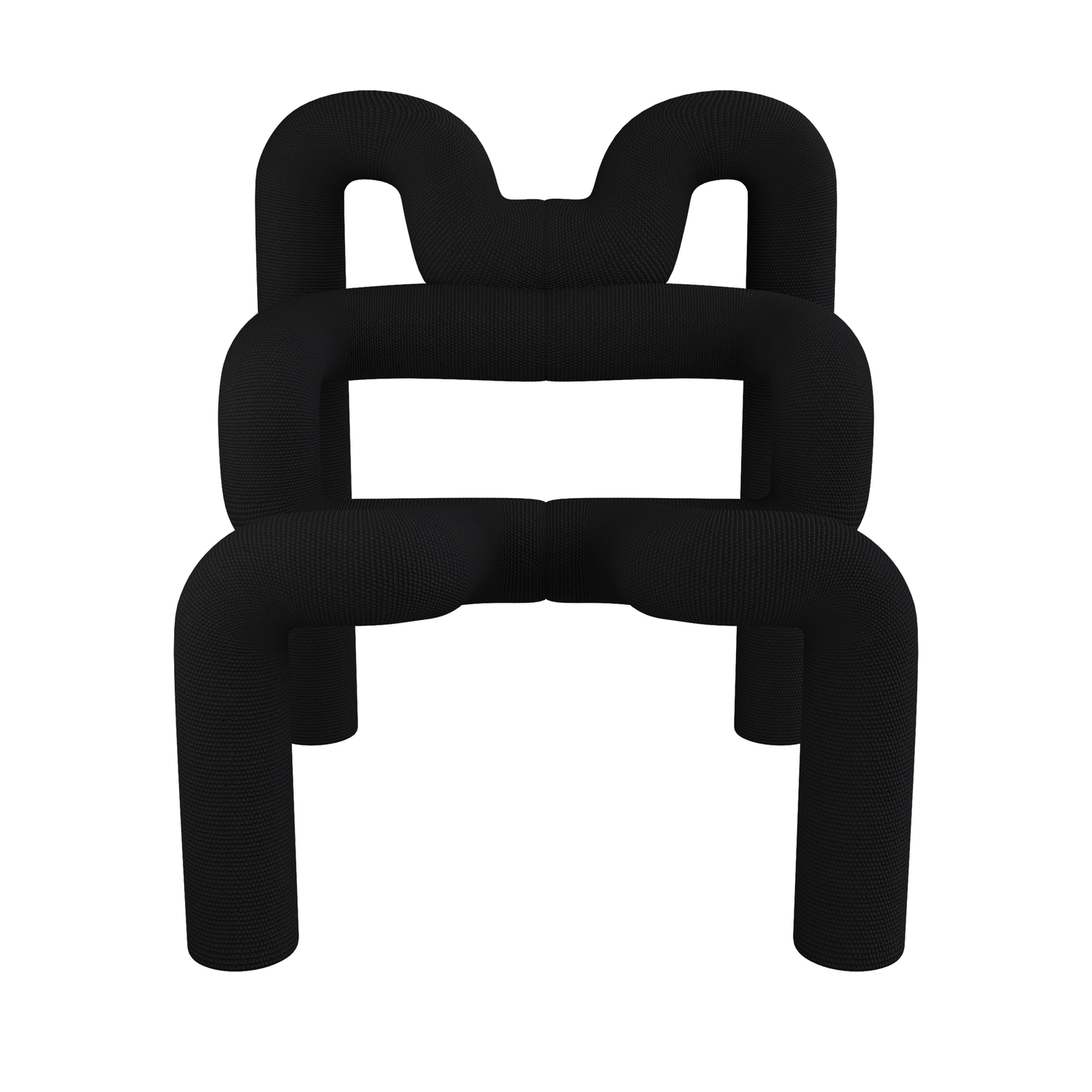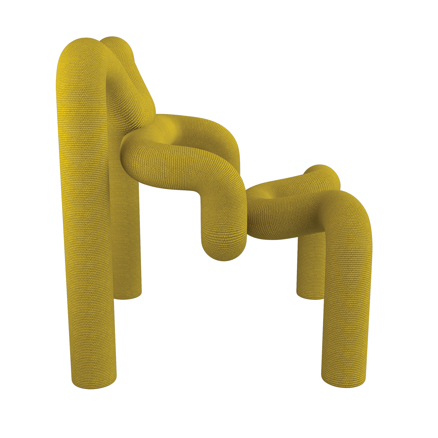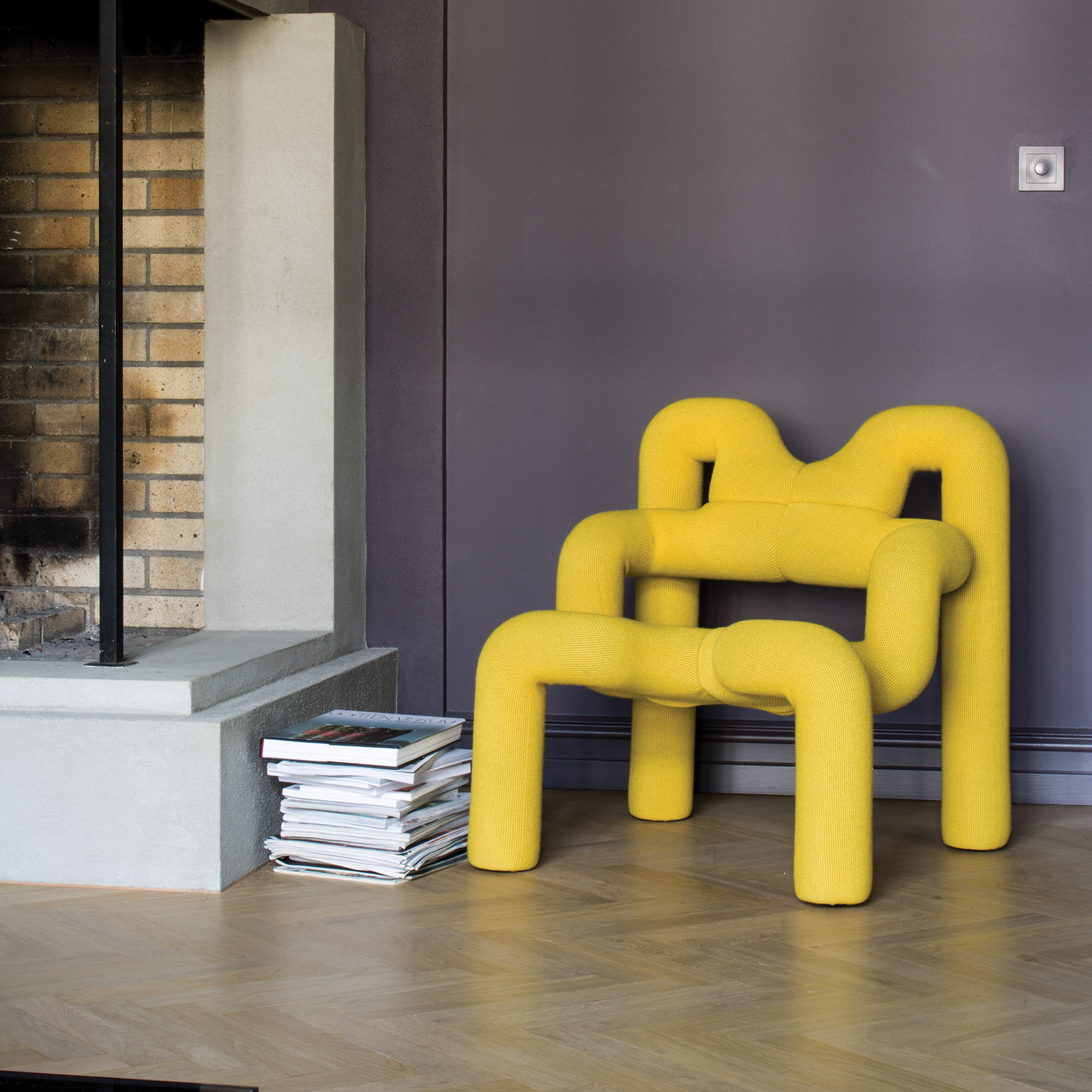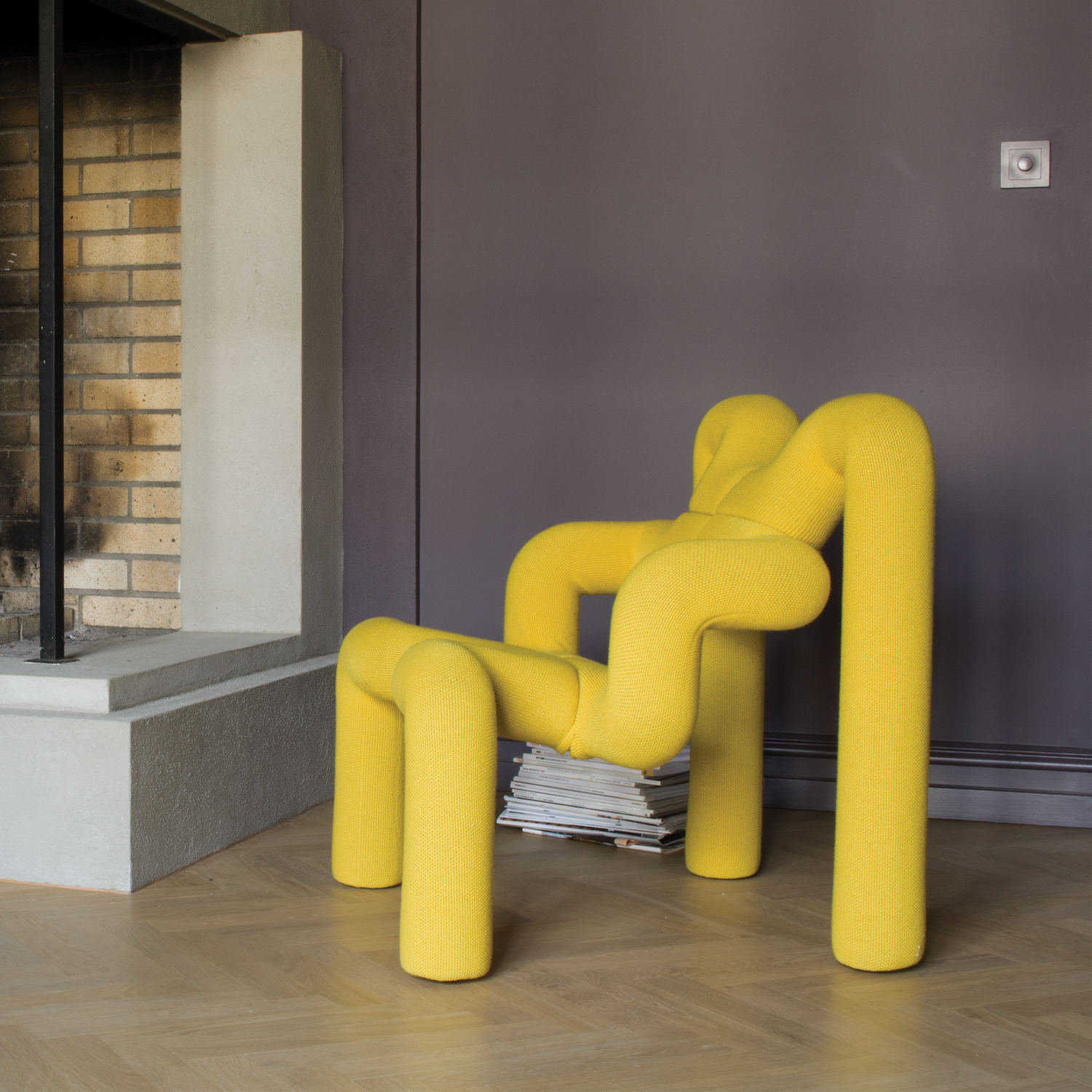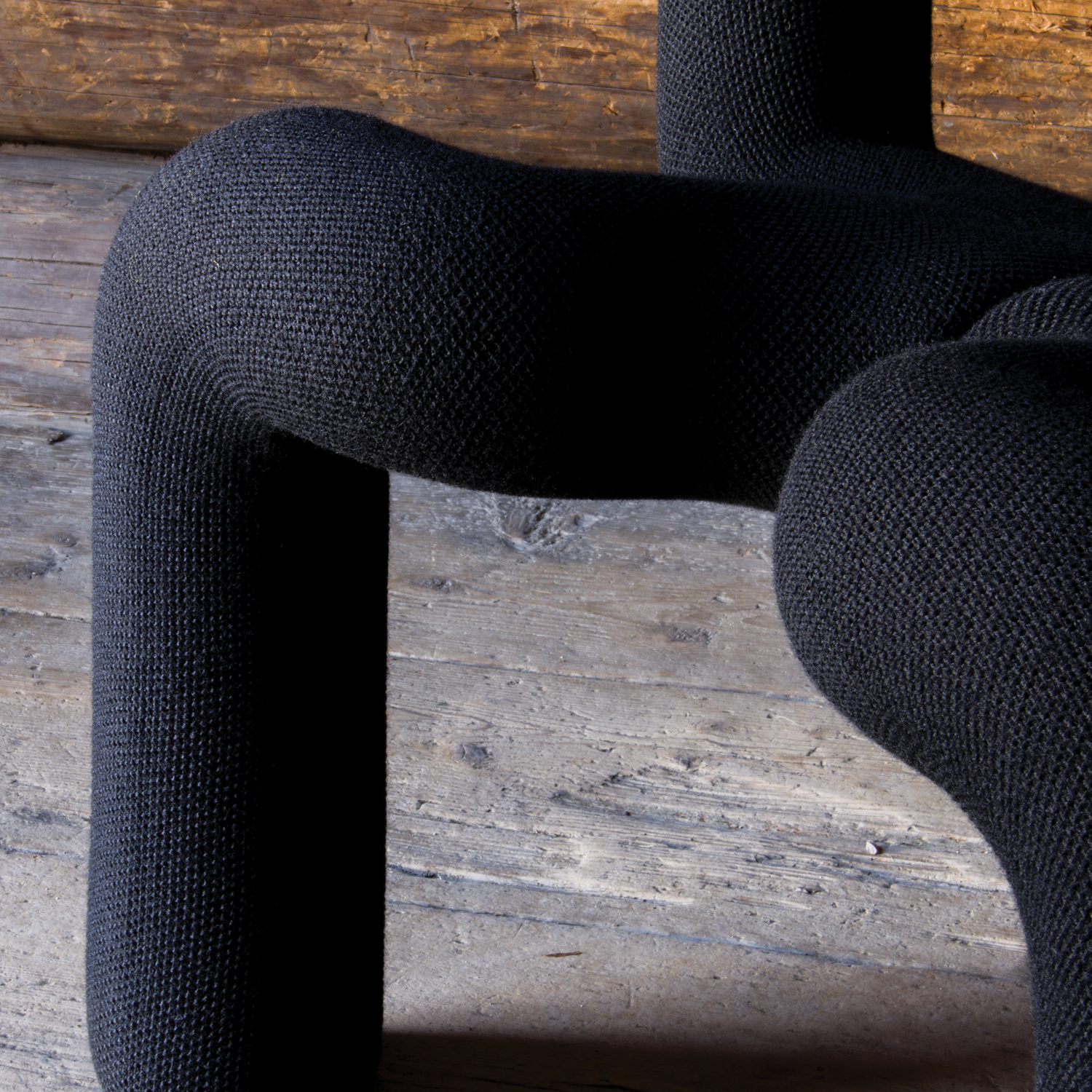 Ekstrem consists of a steel frame covered in soft foam and woolen knit upholstery. It is available in six colorways in Knit, a bespoke woolen upholstery textile by Devold. Knitted from one continuous thread, it provides an elasticity that is essential when fitted to the chair’s organic shape. The knitted fabric is soft, breathable and features a classic quadratic pattern.