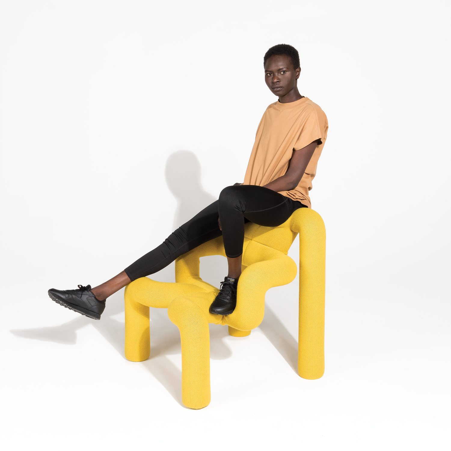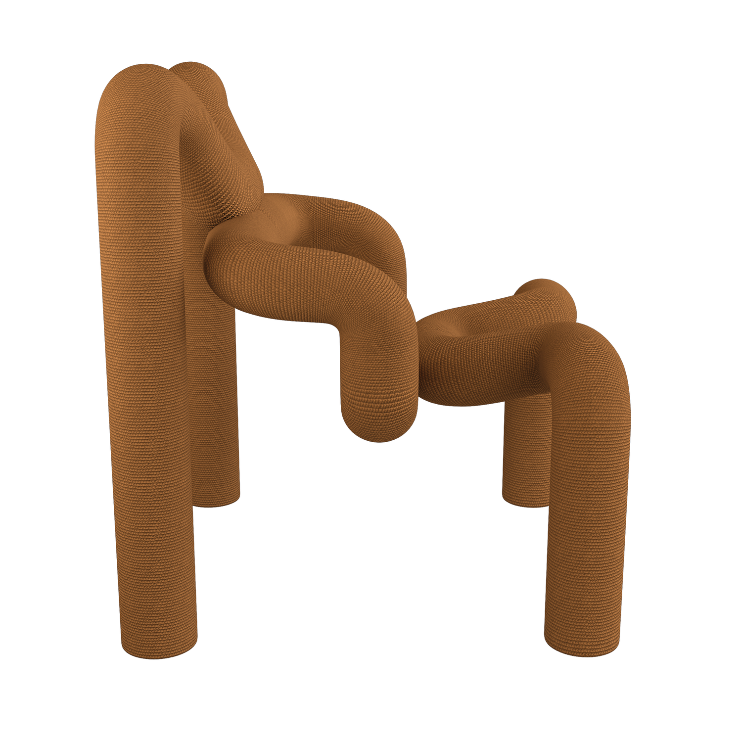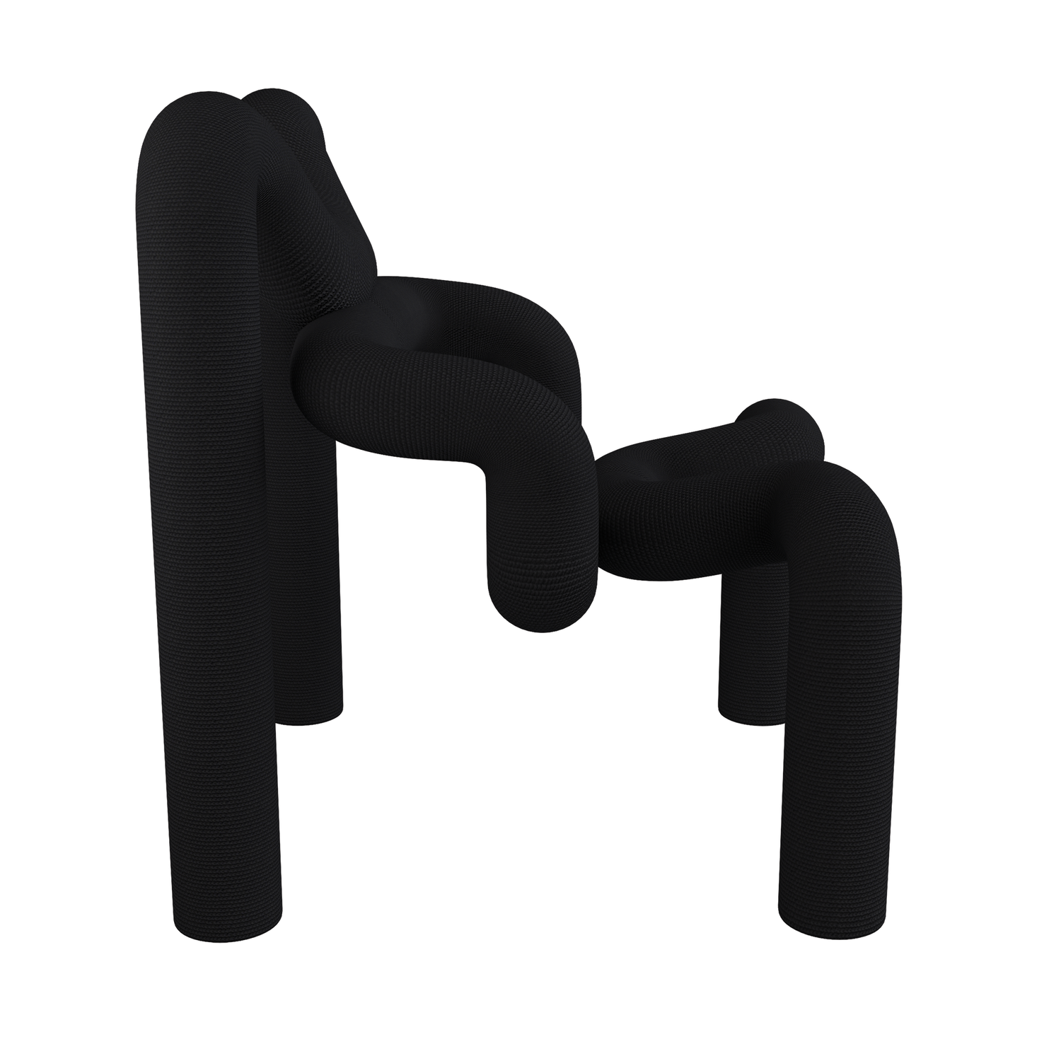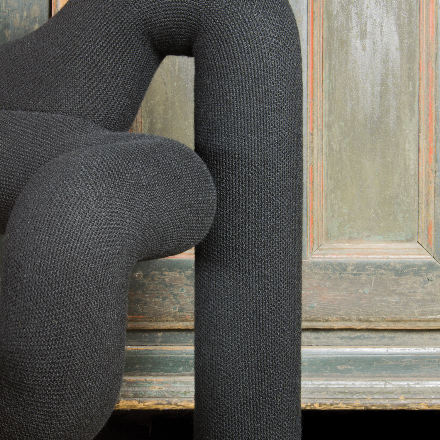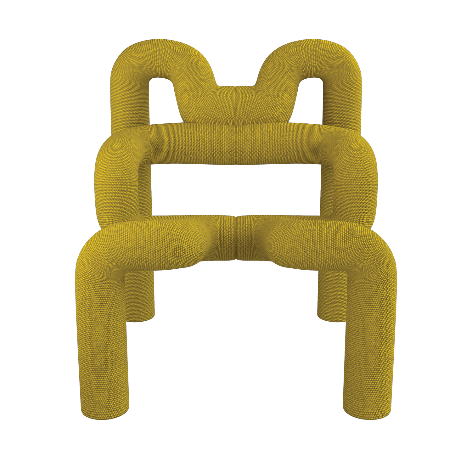 Ekstrem consists of a steel frame covered in soft foam and woolen knit upholstery. It is available in six colorways in Knit, a bespoke woolen upholstery textile by Devold. Knitted from one continuous thread, it provides an elasticity that is essential when fitted to the chair’s organic shape. The knitted fabric is soft, breathable and features a classic quadratic pattern.