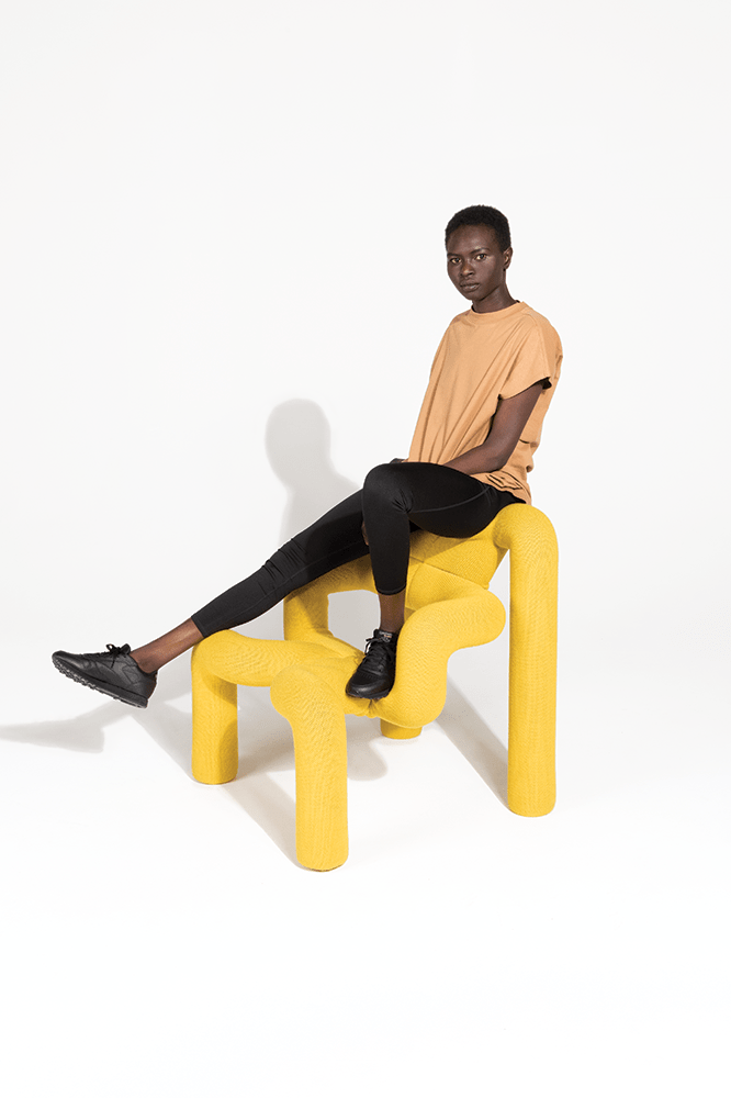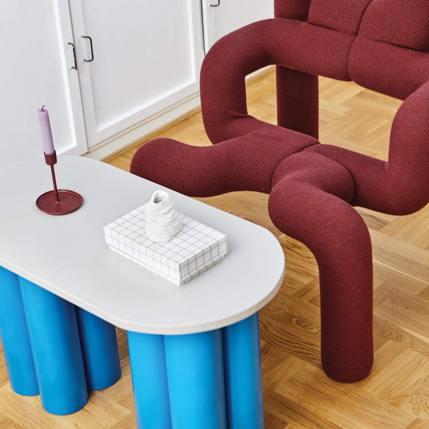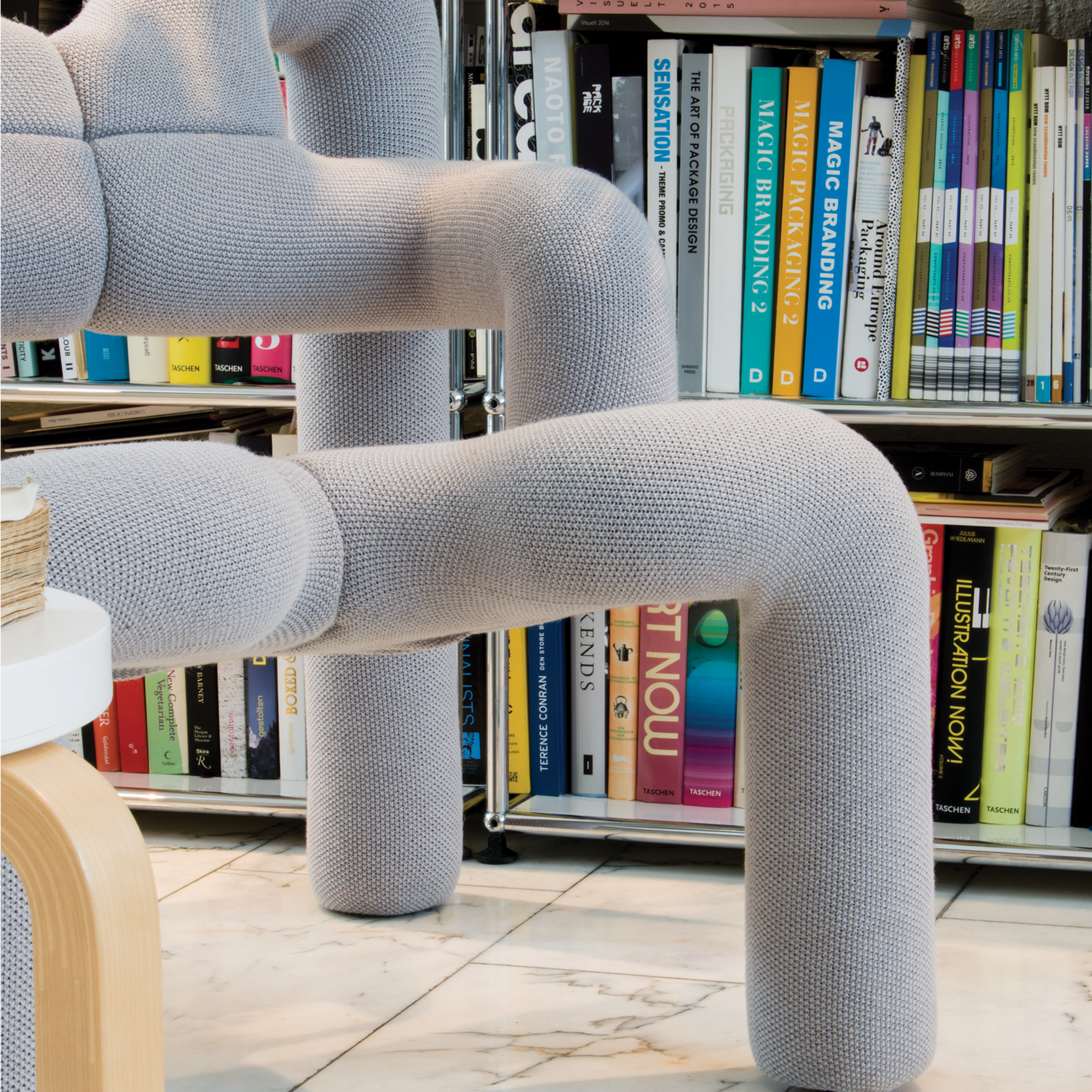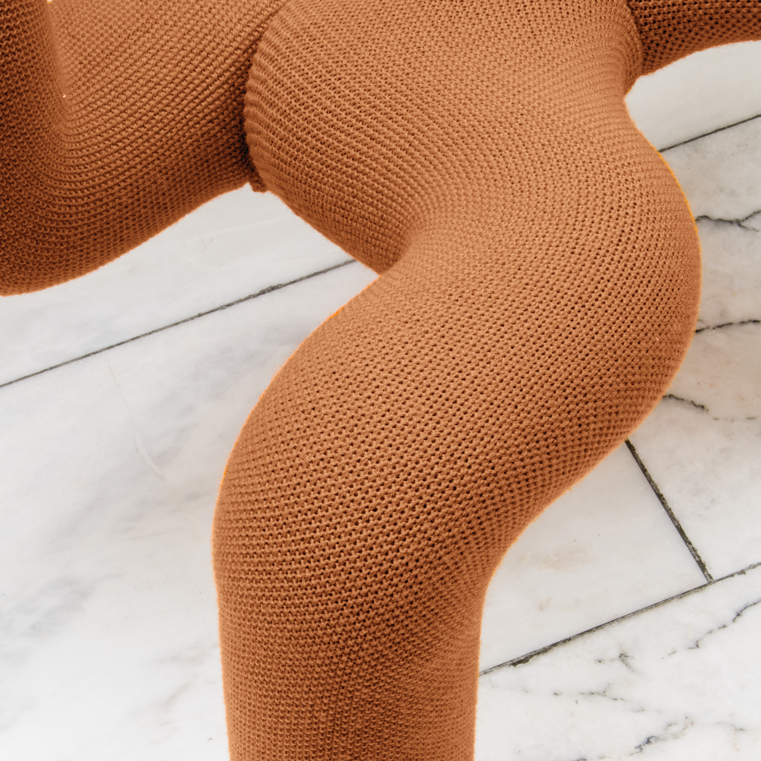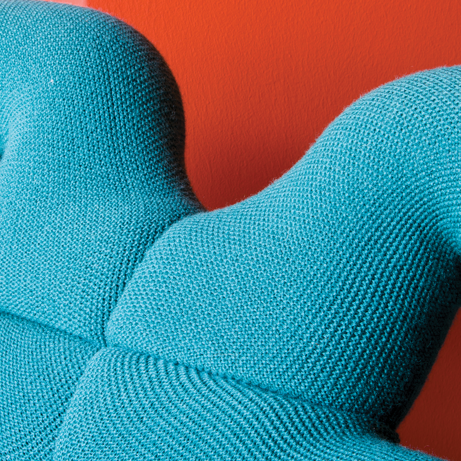 Ekstrem consists of a steel frame covered in soft foam and woolen knit upholstery. It is available in six colorways in Knit, a bespoke woolen upholstery textile by Devold. Knitted from one continuous thread, it provides an elasticity that is essential when fitted to the chair’s organic shape. The knitted fabric is soft, breathable and features a classic quadratic pattern.
