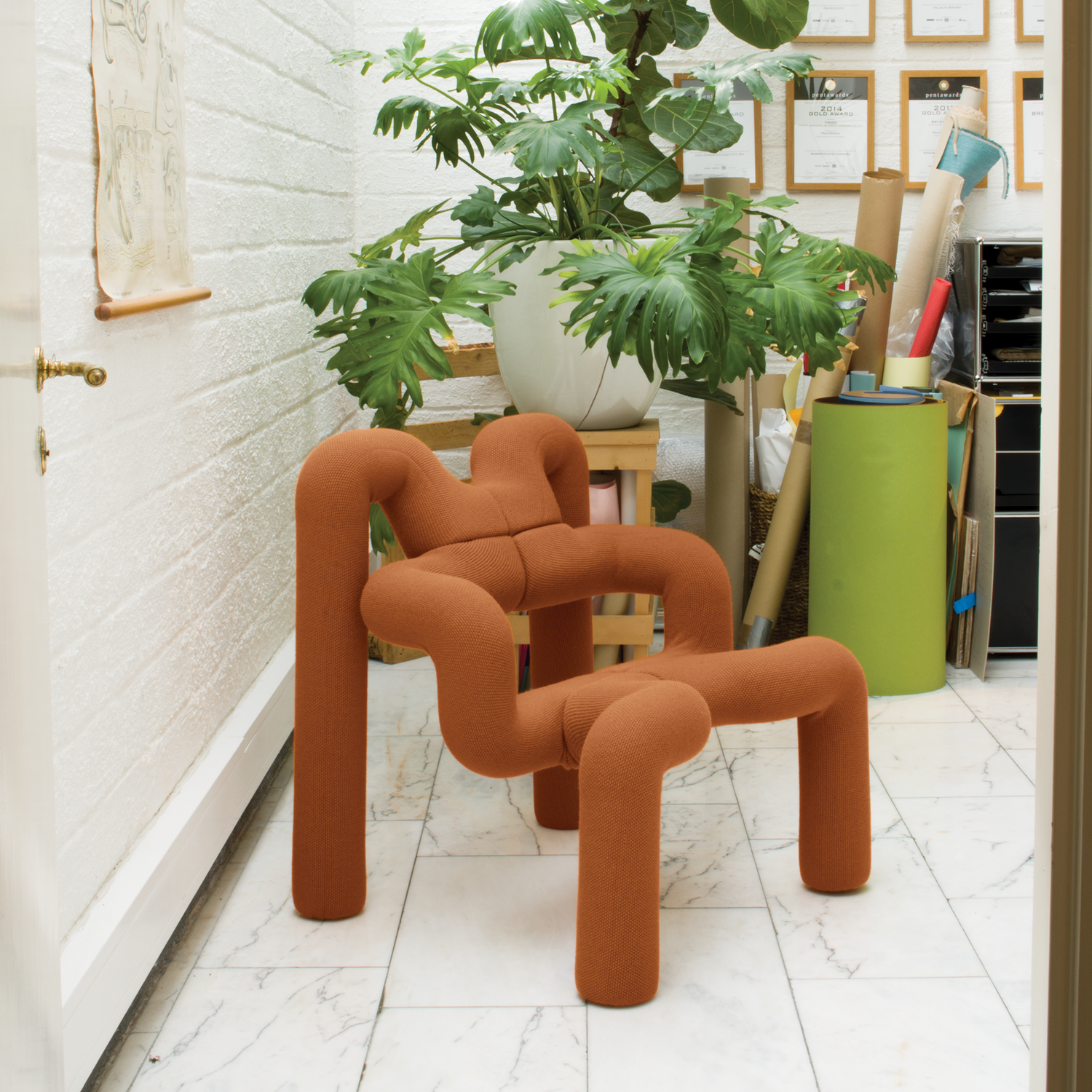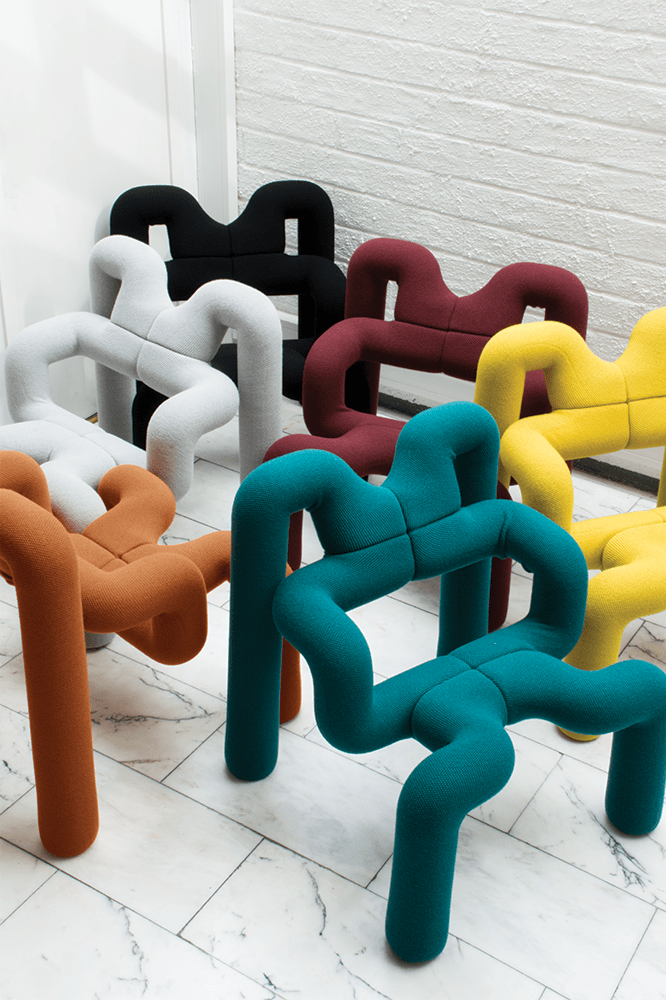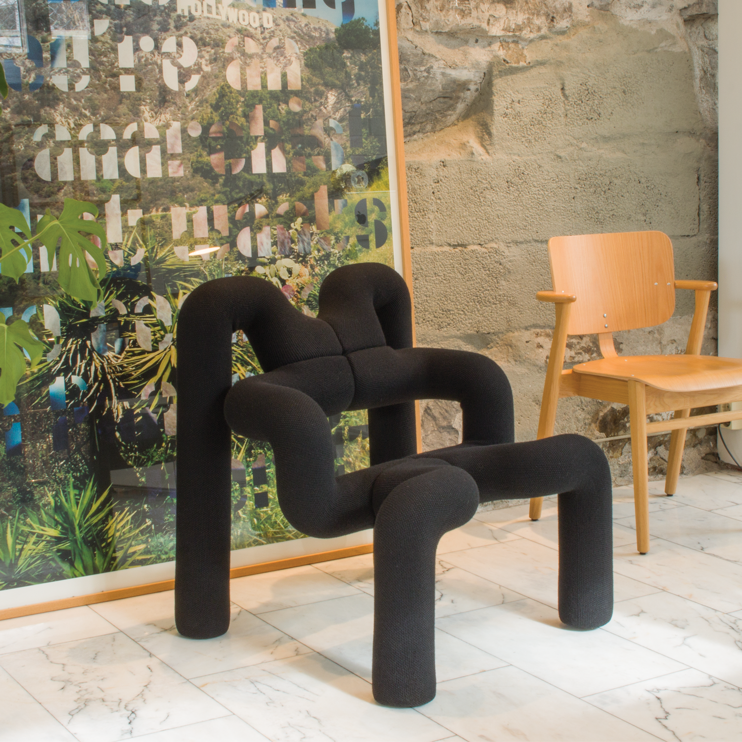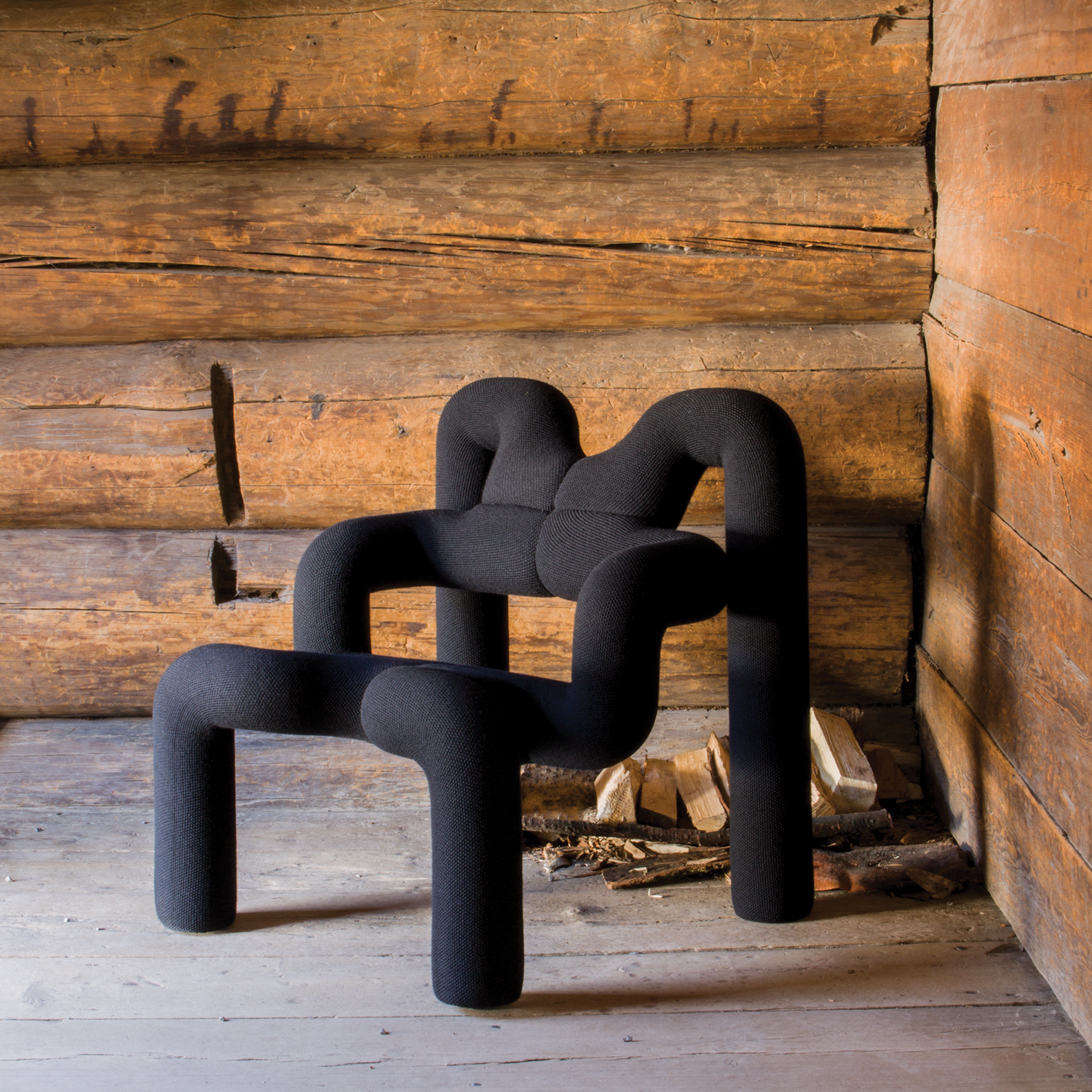 Designed by Terje Ekstrøm for Varier, Ekstrem is not merely a chair, but rather a stand-alone object. It represents one of Norway’s first postmodern designs. Its unexpected geometrics allows you to sit forward with feet on the ground, sideways with legs placed on the armrests or completely backward with the front of the torso against the chair’s back. A sitting experience that can only be described as out of the ordinary.