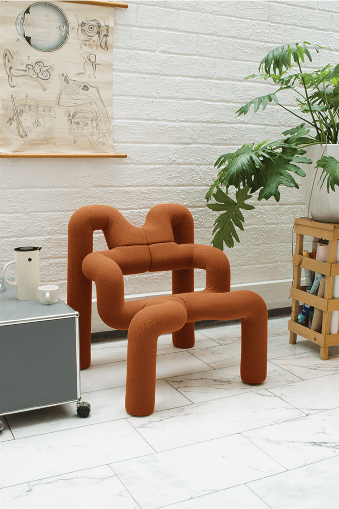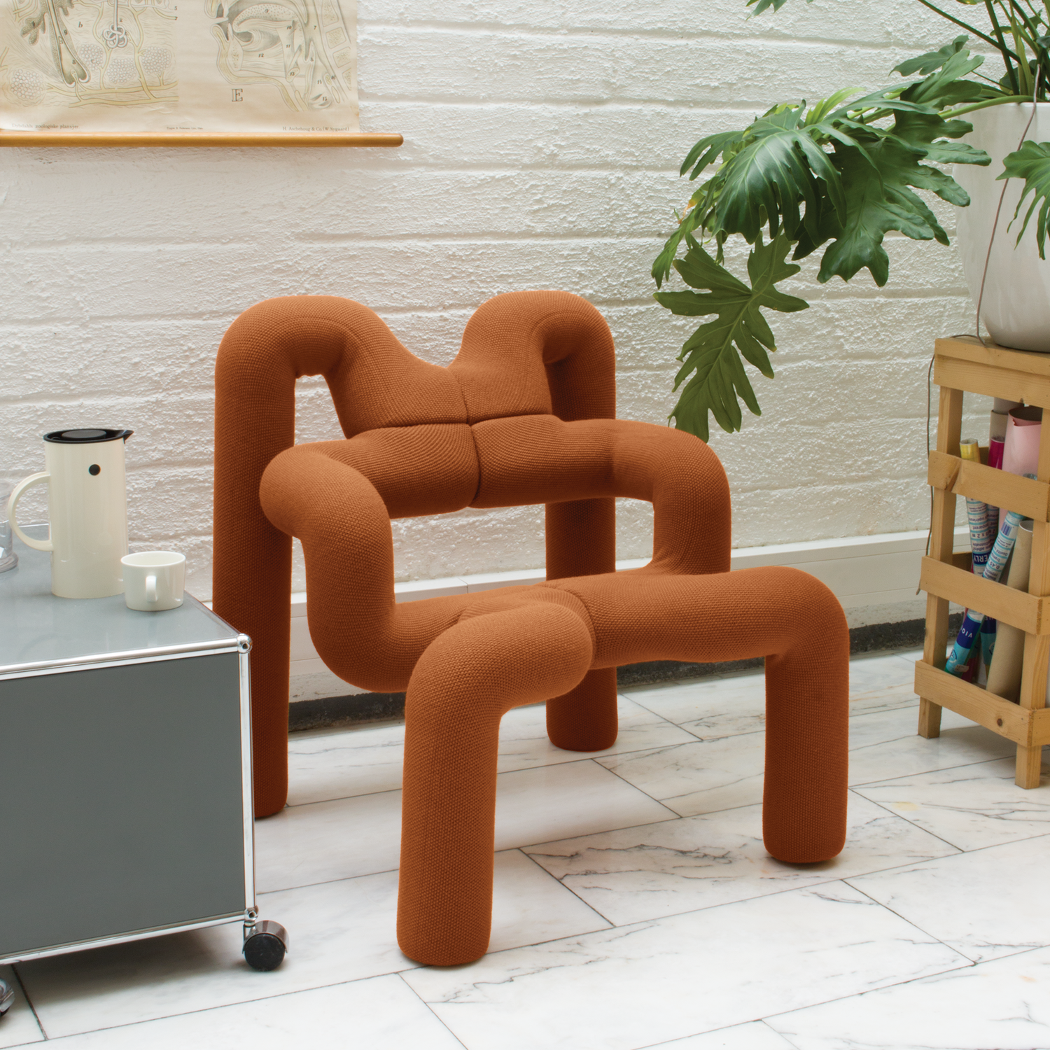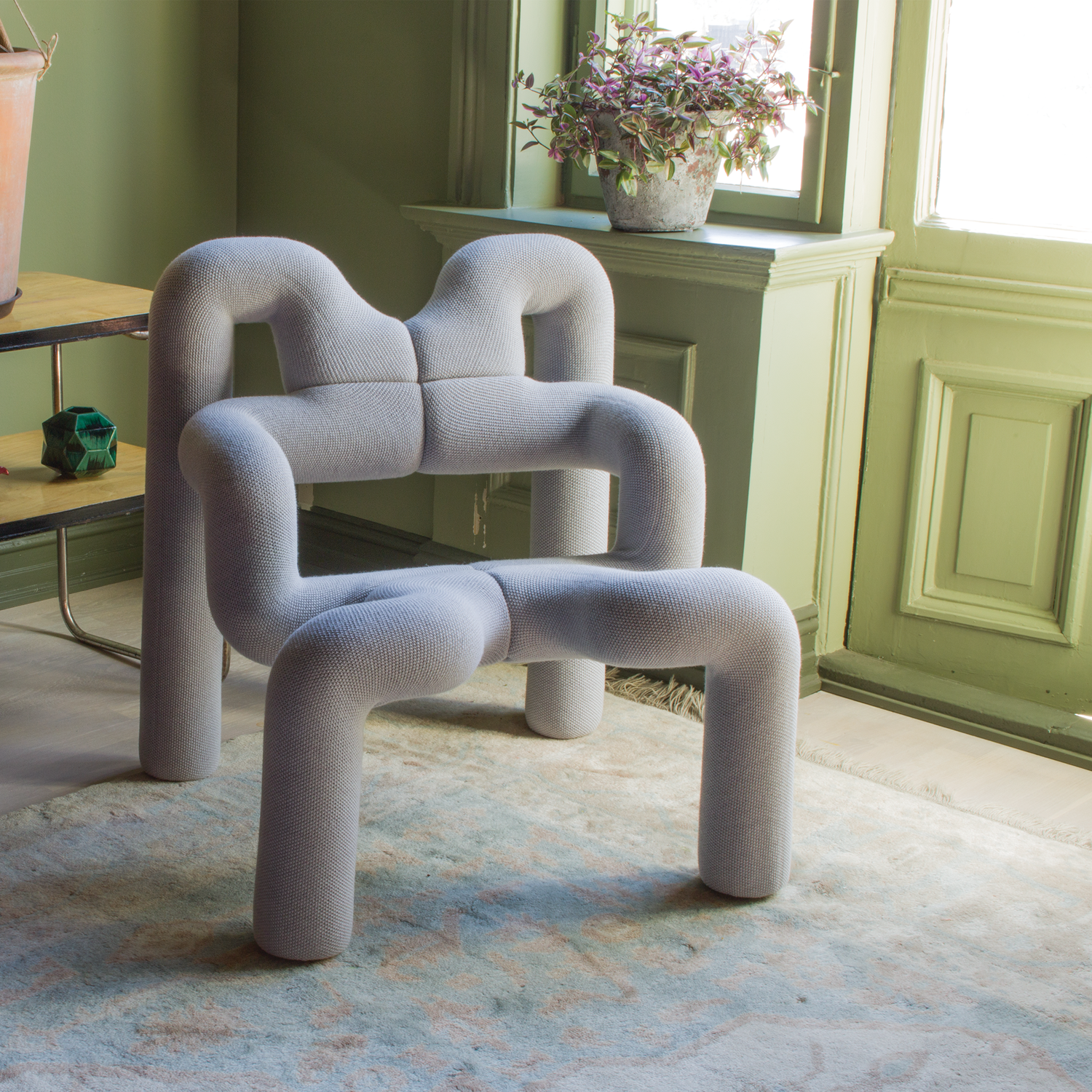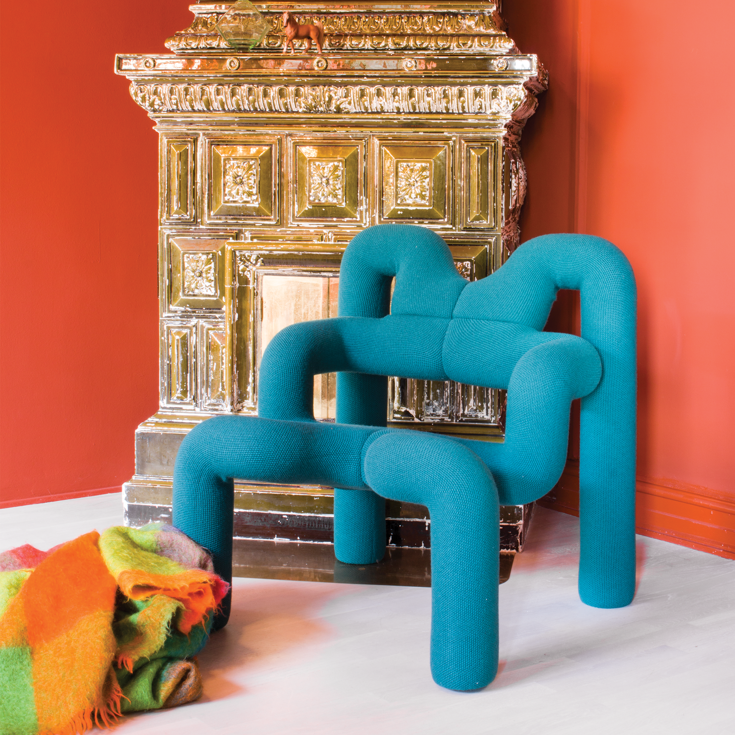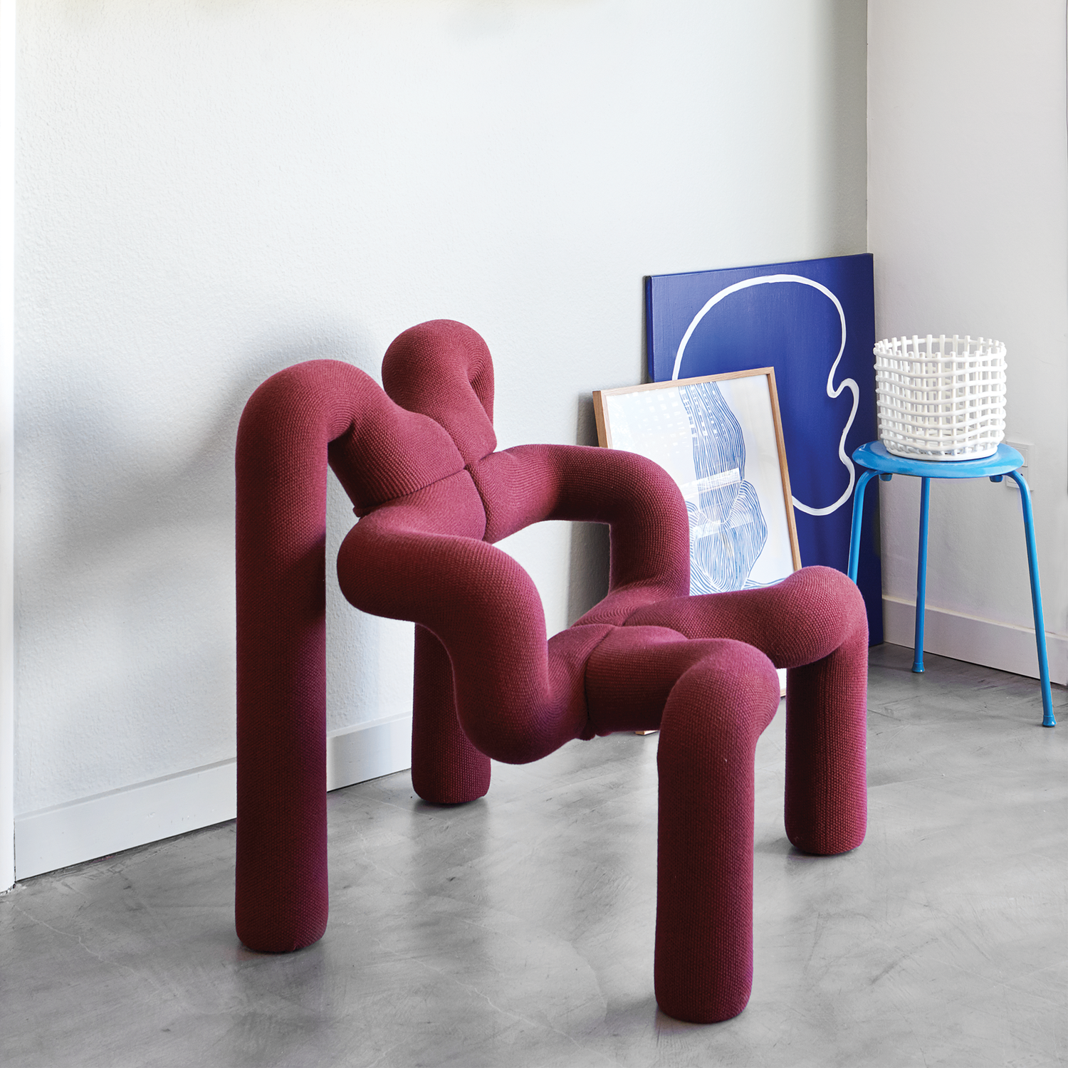 Designed by Terje Ekstrøm for Varier, Ekstrem is not merely a chair, but rather a stand-alone object. It represents one of Norway’s first postmodern designs. Its unexpected geometrics allows you to sit forward with feet on the ground, sideways with legs placed on the armrests or completely backward with the front of the torso against the chair’s back. A sitting experience that can only be described as out of the ordinary.