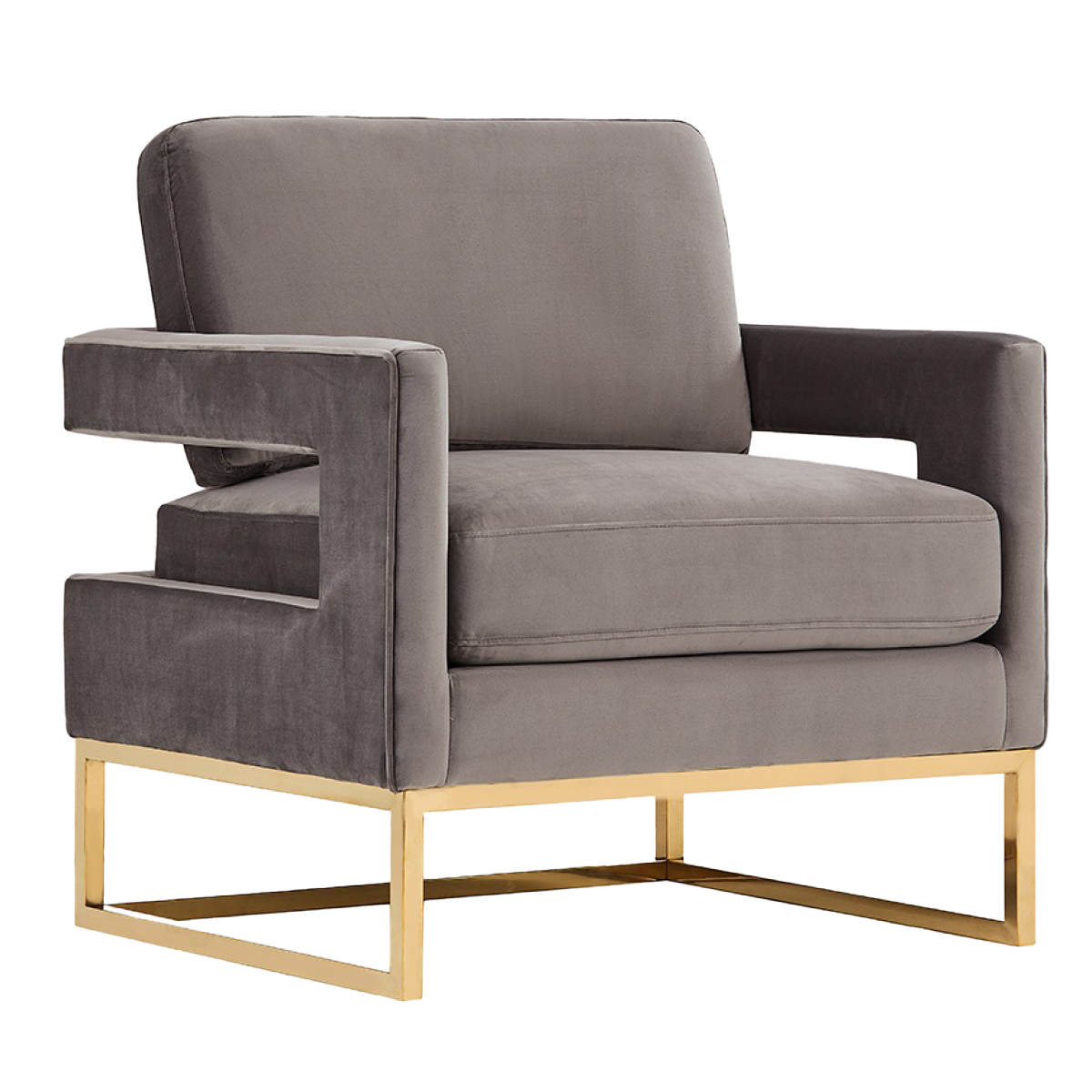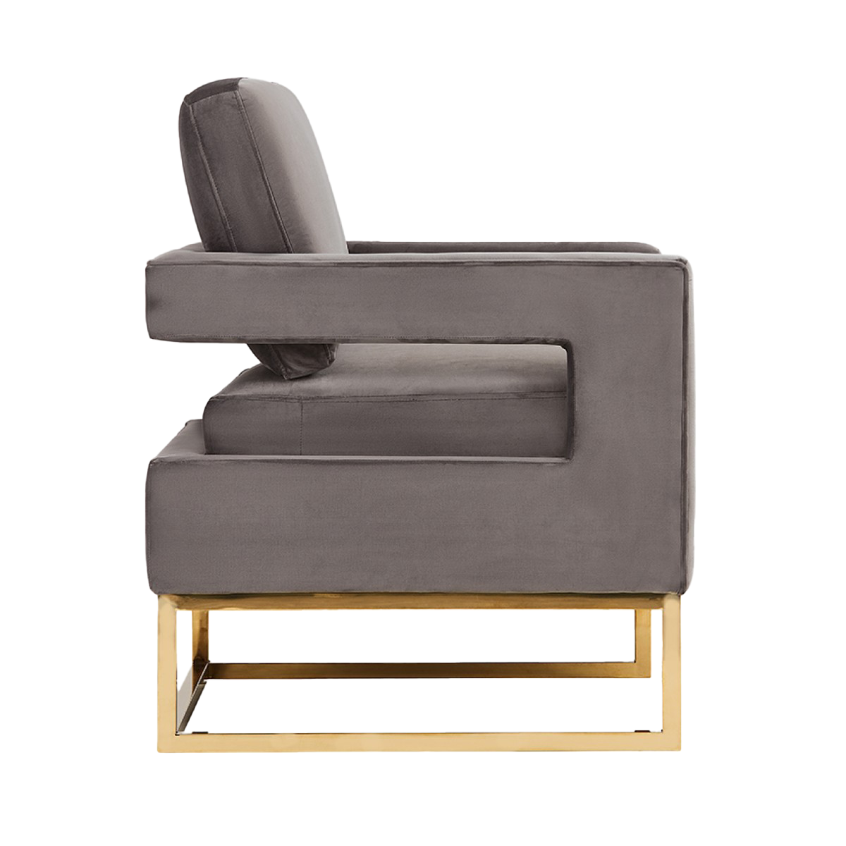 The chair's clean lines and U-shaped back with integrated armrests exude a contemporary elegance that harkens back to the days of art deco. Its minimalist design is accentuated by the contrasting, beautiful gold stainless steel frame. The open sides and geometric lines create a sense of space and lightness, making the chair a stunning addition to various interior styles, from minimalist to mid-century modern.