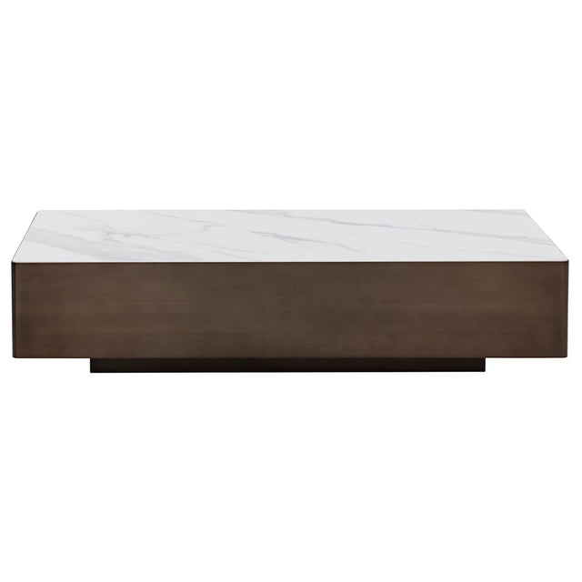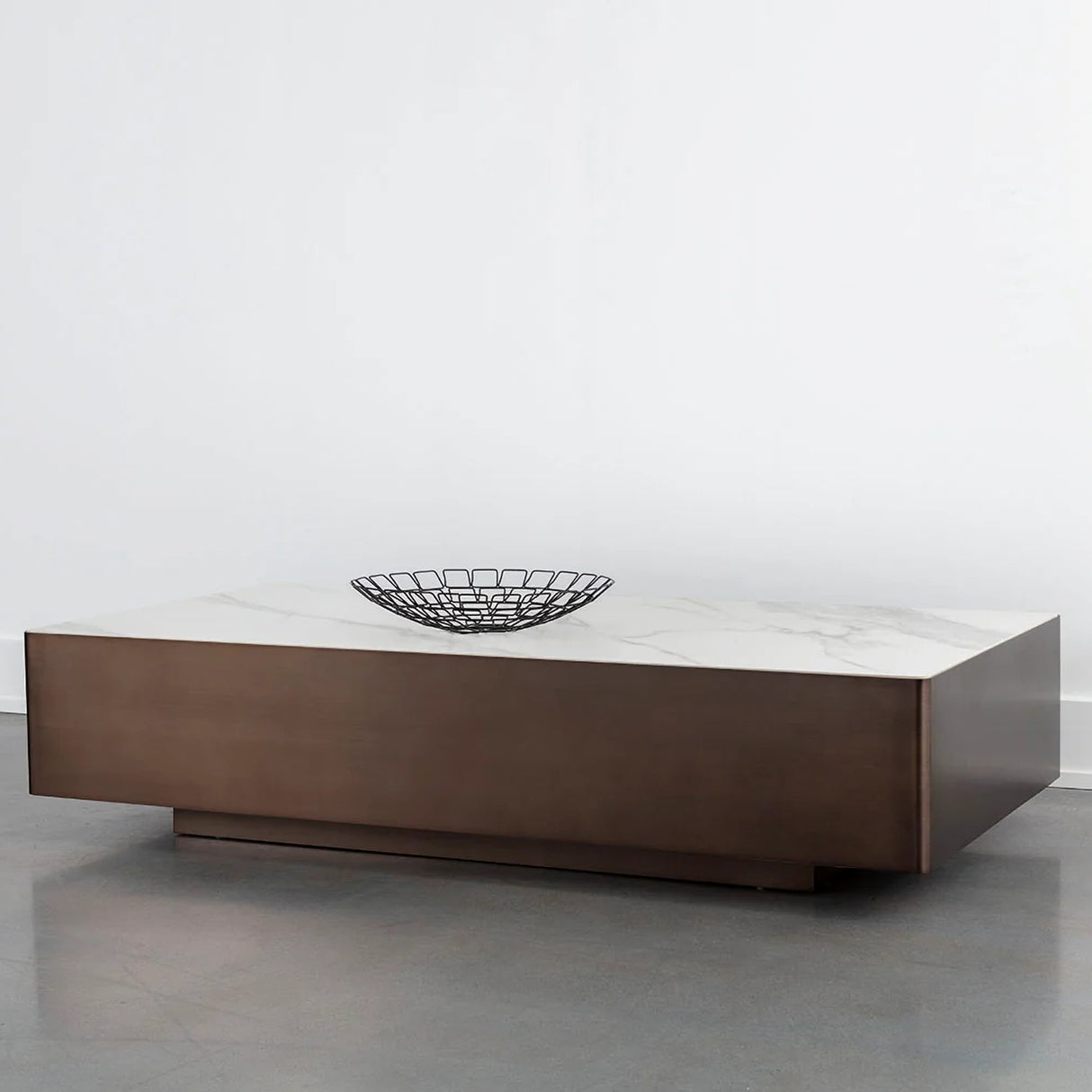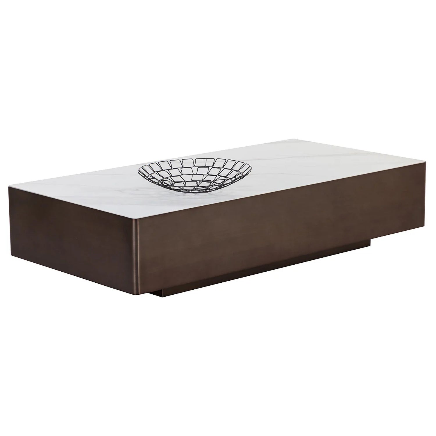 The Lenay Coffee Table is a sophisticated centerpiece that combines minimalist elegance with contemporary functionality. Featuring a stunning white marble-look ceramic top, this table is both durable and stylish. The clean, rectangular silhouette is supported by a sleek dark bronze stainless steel base, creating a balanced aesthetic perfect for modern and transitional interiors.