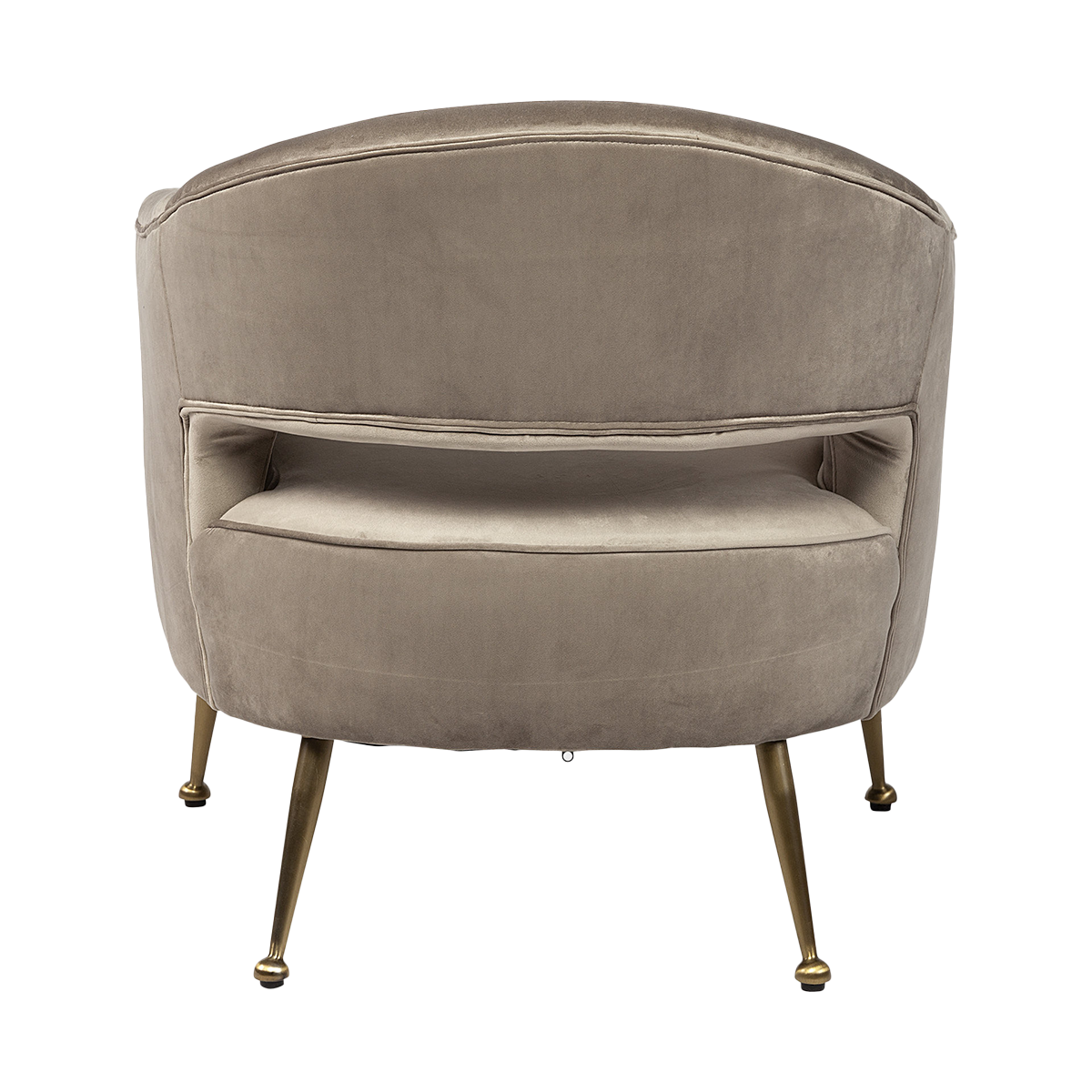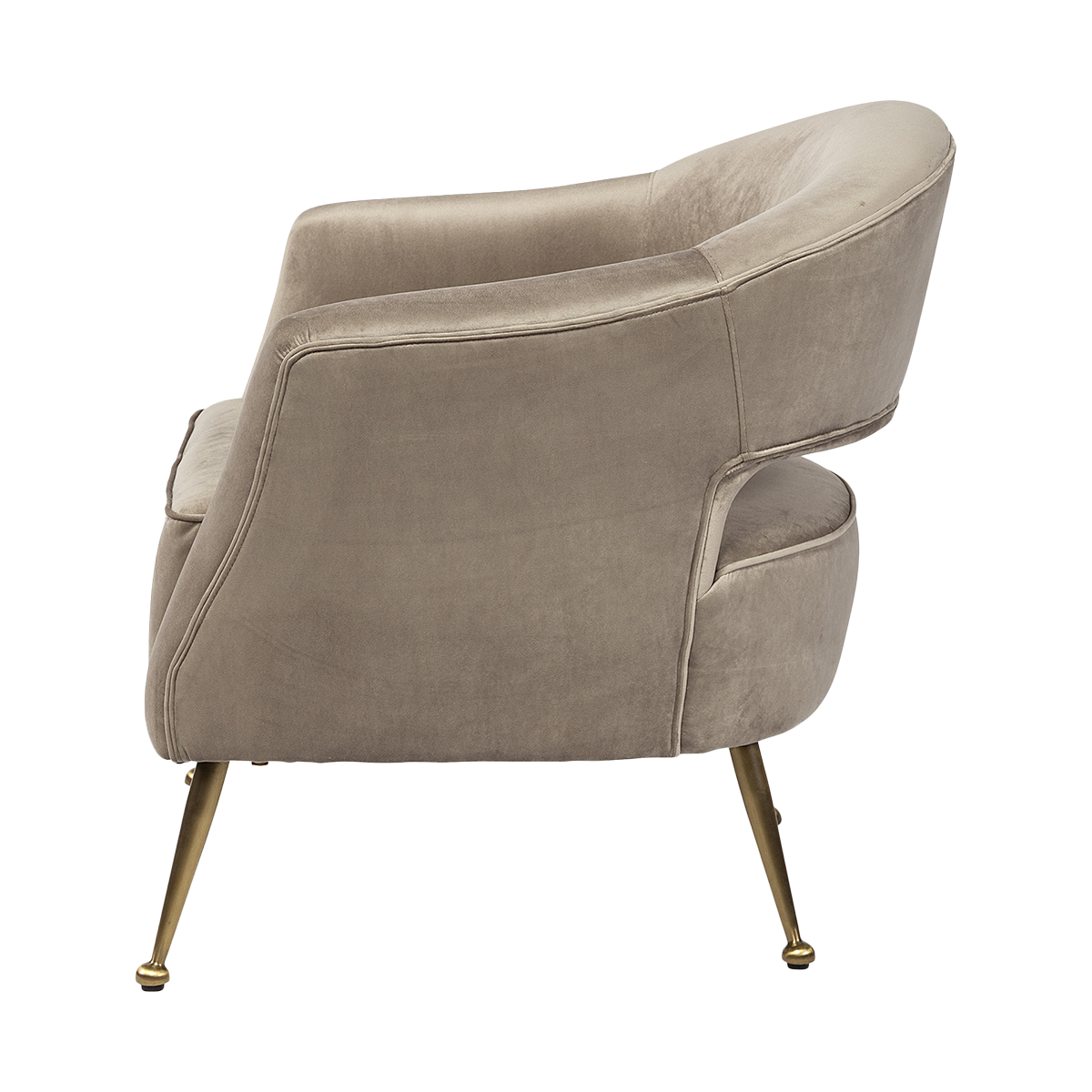 The rich taupe hue of the velvet upholstery exudes warmth and sophistication, easily integrating into most color palettes. The antiqued brass metal legs offer a beautiful contrast to the soft velvet, adding a striking accent and long-lasting durability. Its signature notched back adds depth and dimension to achieve a fashionable silhouette.