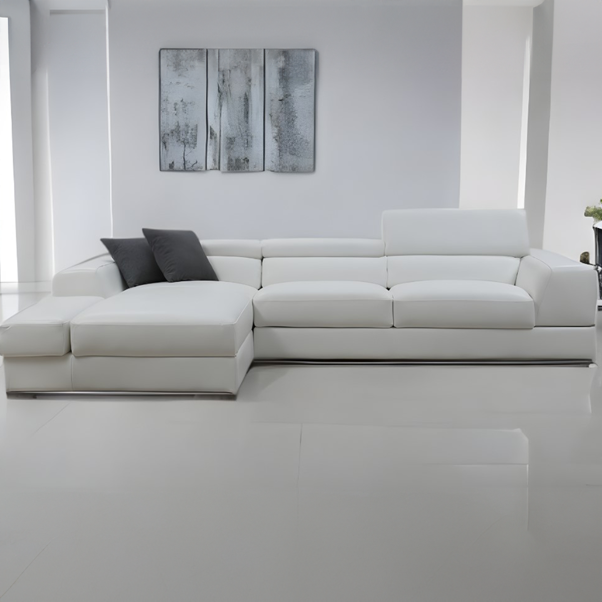 The sleek, low-profile construction and clean lines make it a versatile piece that blends with various interior styles, from modern minimalism to coastal chic. The crisp white leather creates a sense of elegance and spaciousness, making your living room feel bright and inviting. Add decorative throw pillows for a powerful pop of color and let this couch anchor your décor against a neutral backdrop.